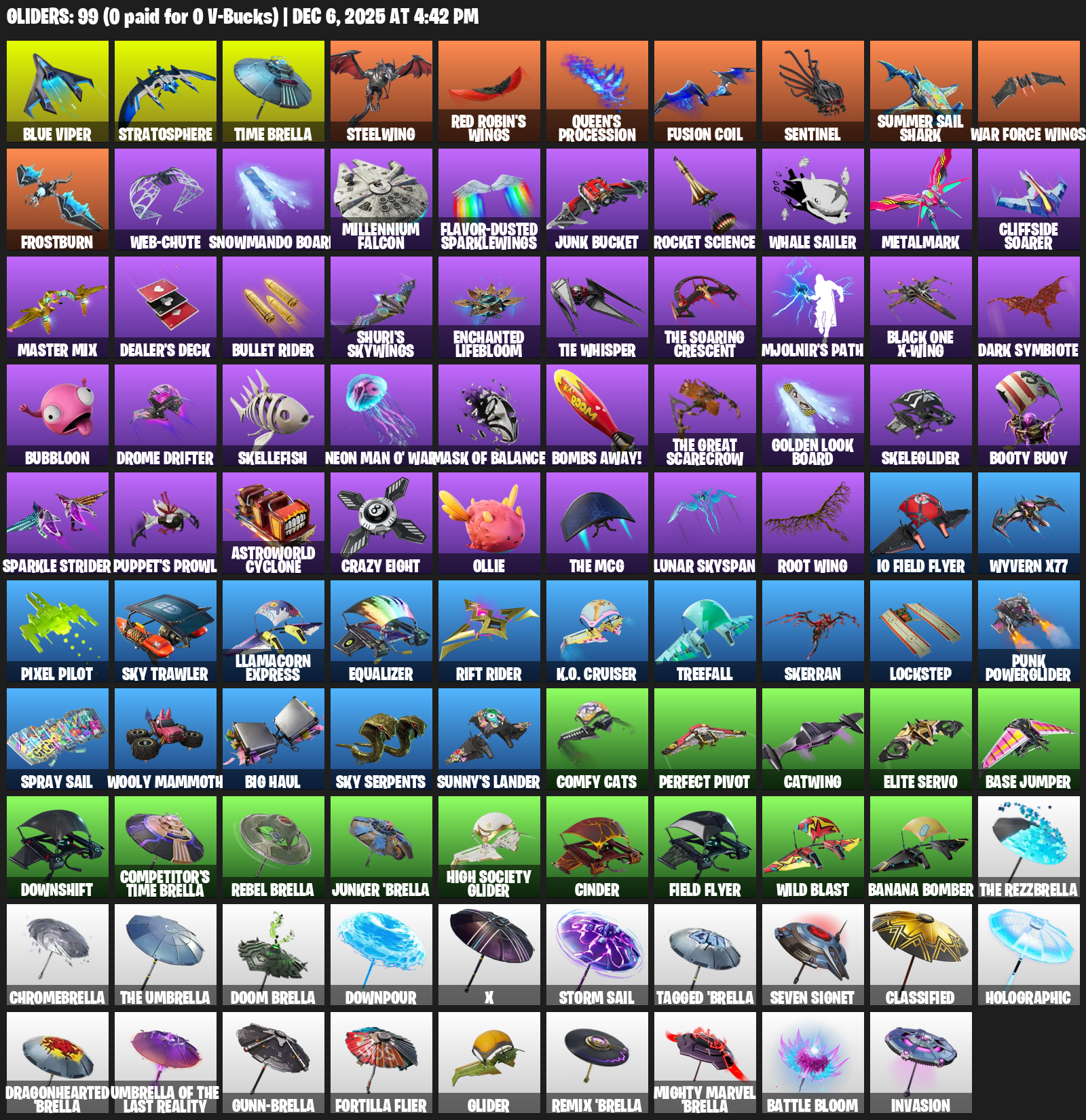 Blue Viper, Stratosphere, Time Brella, Steelwing, Red Robin’s Wings, Queen’s Procession, Sentinel, Summer Sail Shark, Frostburn, Snowmando Board, Millennium Falcon, Flavor-Dusted Sparklewings, Junk Bucket, Rocket Science, Whale Sailer, Metalmark, Cliffside Soarer