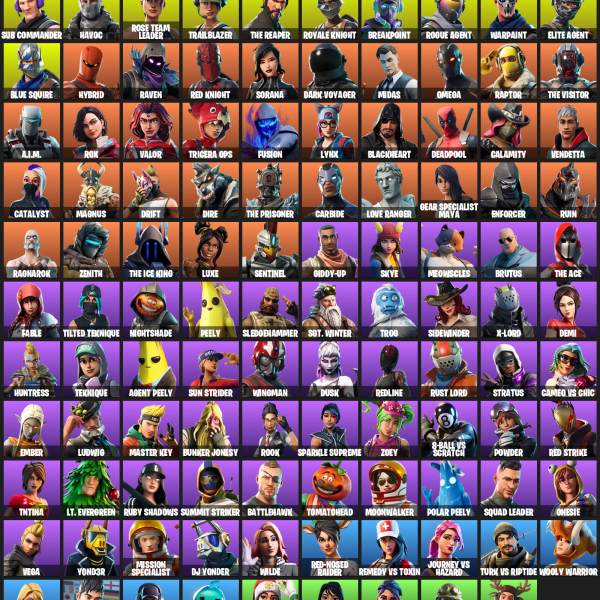 The Reaper, Blue Squire, Elite Agent, Royale Knight, Omega, Trailblazer, Warpaint, Rose Team Leader, Huntmaster Saber, Catalyst, Hybrid, Carbide, Lynx, Rex, Drift, Omegarok, Blackheart