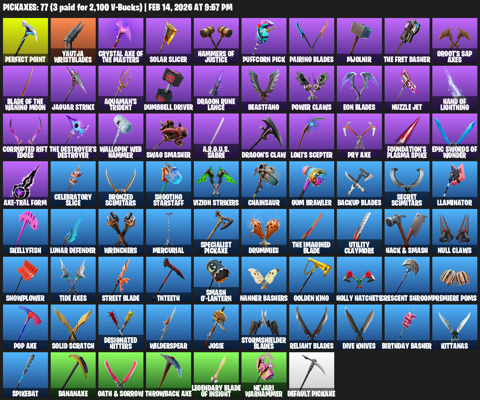 Yautja Wristblades, Solar Slicer, Hammers of Justice, Puffcorn Pick, Pairing Blades, Mjolnir, Groot’s Sap Axes, Jaguar Strike, Aquaman’s Trident, Dumbbell Driver, Dragon Rune Lance, Beastfang, Power Claws, Nuzzle Jet