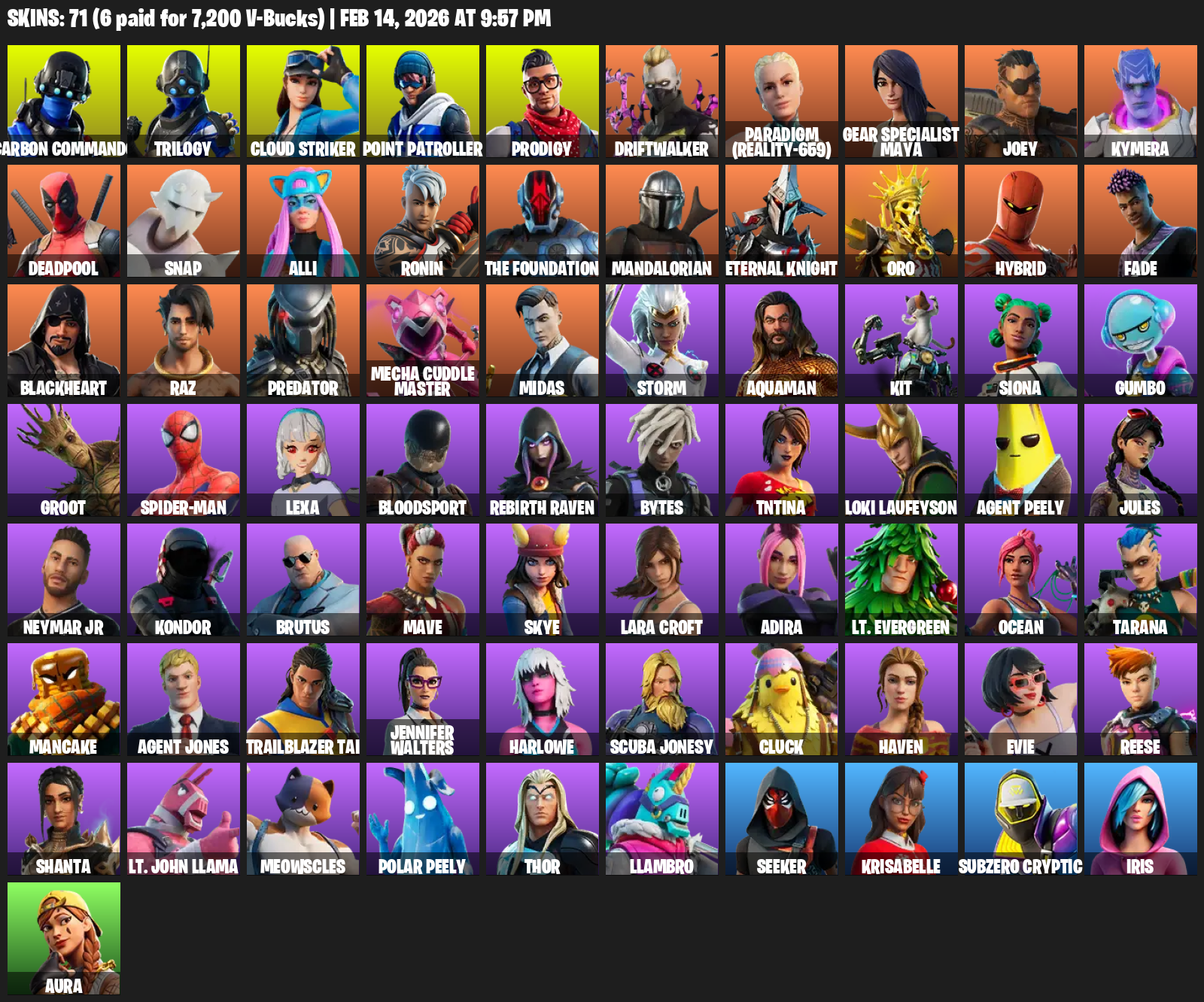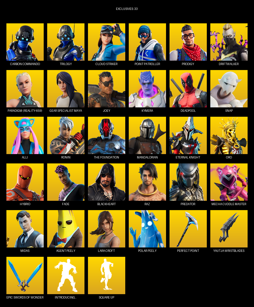 Point Patroller, Gear Specialist Maya, Lara Croft, Carbon Commando, Trilogy, Cloud Striker, Prodigy, Driftwalker, Paradigm (Reality-659), Joey, Kymera, Deadpool, Snap, Alli, Ronin, The Foundation, Mandalorian, Eternal Knight, Oro, Hybrid