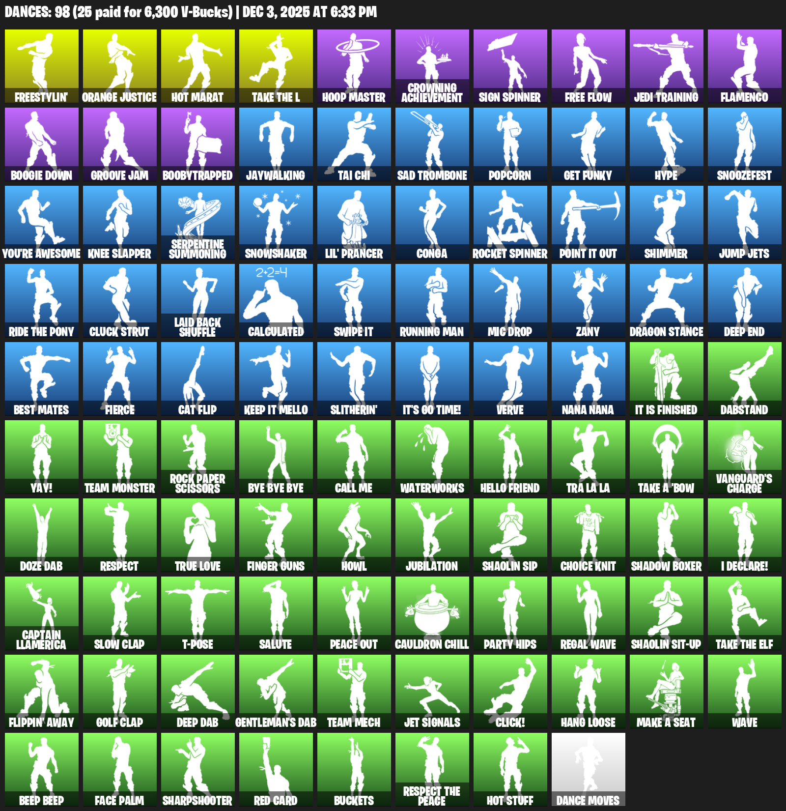Freestylin’, Orange Justice, Hoop Master, Crowning Achievement, Sign Spinner, Free Flow, Jedi Training, Flamenco, Boogie Down, Groove Jam, Boobytrapped, Jaywalking, Tai Chi, Sad Trombone, Popcorn, Get Funky, Hype, Snoozefest