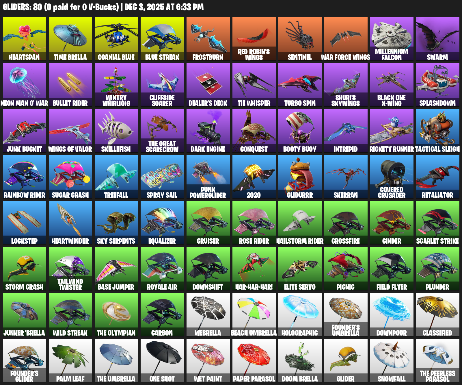 Heartspan, Time Brella, Frostburn, Red Robin’s Wings, Millennium Falcon, Swarm, Neon Man O’ War, Bullet Rider, Wintry Whirligig, Cliffside Soarer, Dealer’s Deck, TIE Whisper, Turbo Spin, Shuri’s Skywings, Black One X-wing, Splashdown