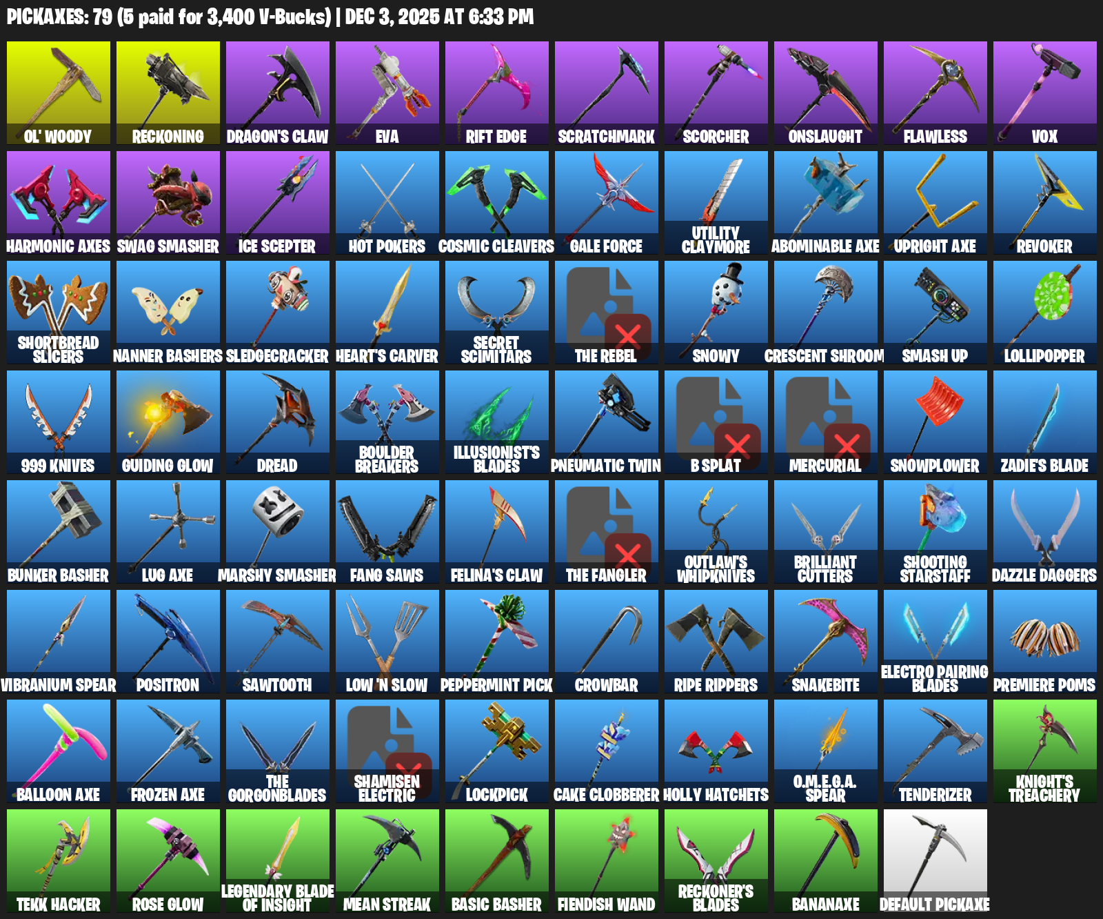 Ol’ Woody, Reckoning, Dragon’s Claw, EVA, Rift Edge, Scratchmark, Scorcher, Onslaught, Flawless, Vox, Harmonic Axes, Swag Smasher, Ice Scepter, Hot Pokers, Cosmic Cleavers, Gale Force, Utility Claymore, Abominable Axe, Revoker
