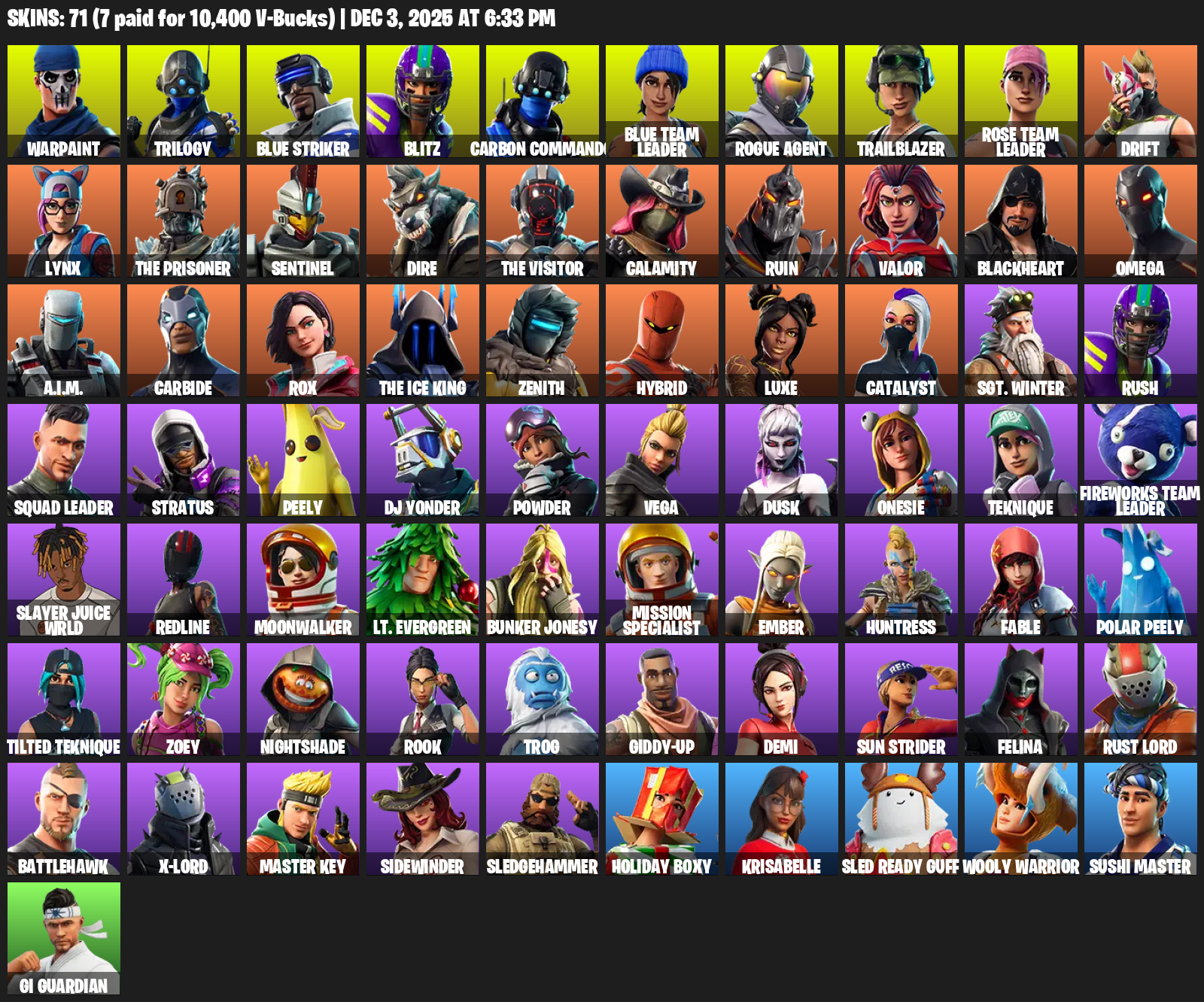 [PC] | 71 skins | Take The L | OG STW | Omega | Warpaint | Trilogy | Blue Striker | Blitz | Carbon Commando | Blue Team Leader | #XVT5827