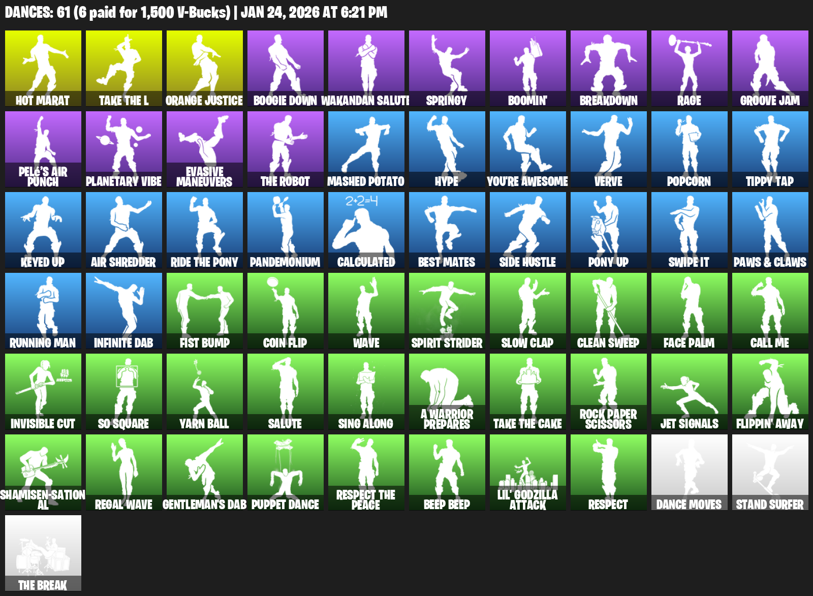 Hot Marat, Boogie Down, Wakandan Salute, Springy, Boomin’, Breakdown, Rage, Groove Jam, Pelé’s Air Punch, Planetary Vibe, Evasive Maneuvers, Mashed Potato, Hype, You’re Awesome, Verve, Popcorn, Tippy Tap