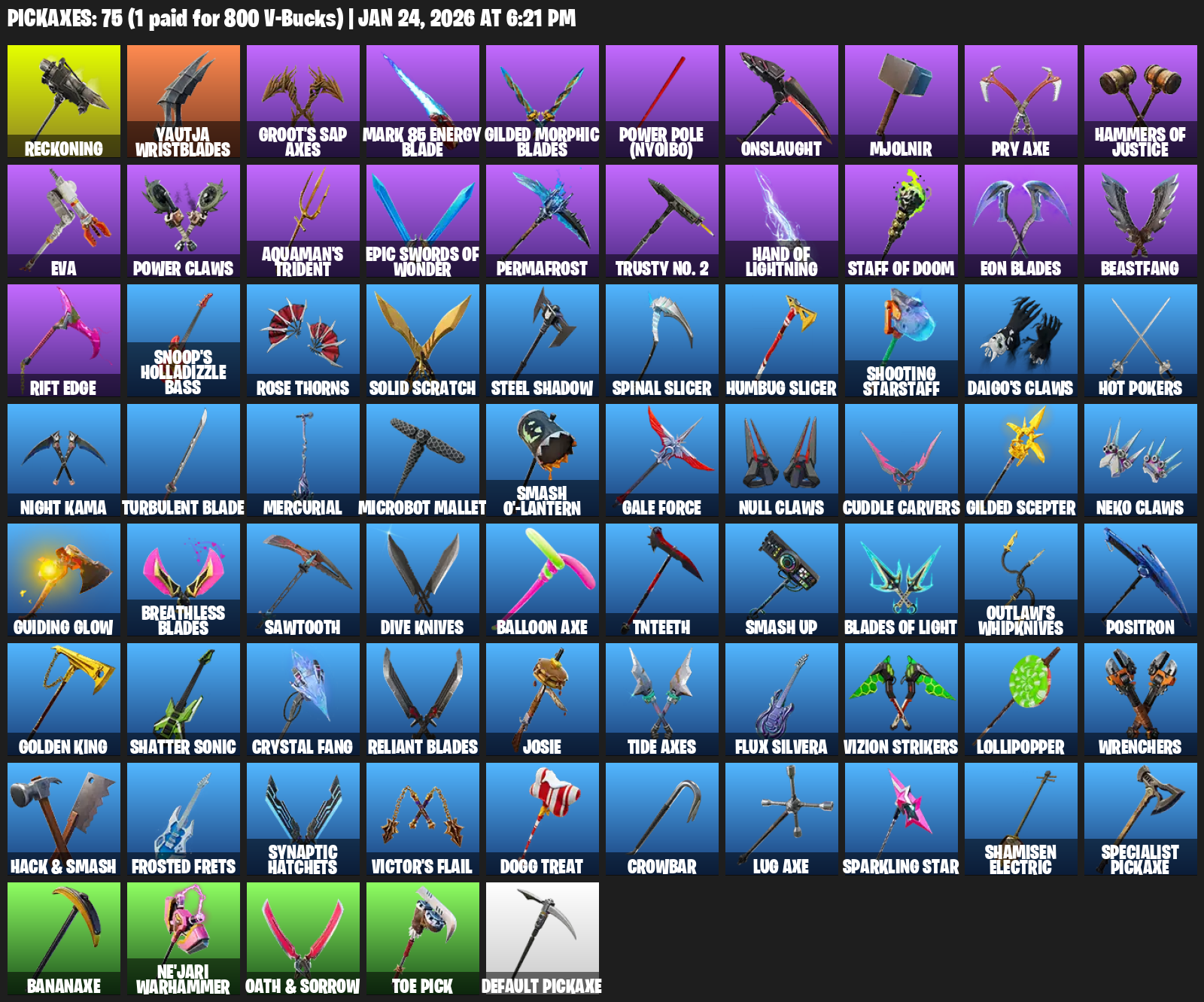 Reckoning, Yautja Wristblades, Groot’s Sap Axes, Mark 85 Energy Blade, Gilded Morphic Blades, Power Pole (Nyoibo), Onslaught, Mjolnir, Pry Axe, Hammers of Justice, EVA, Aquaman’s Trident, Permafrost, Trusty No. 2, Beastfang