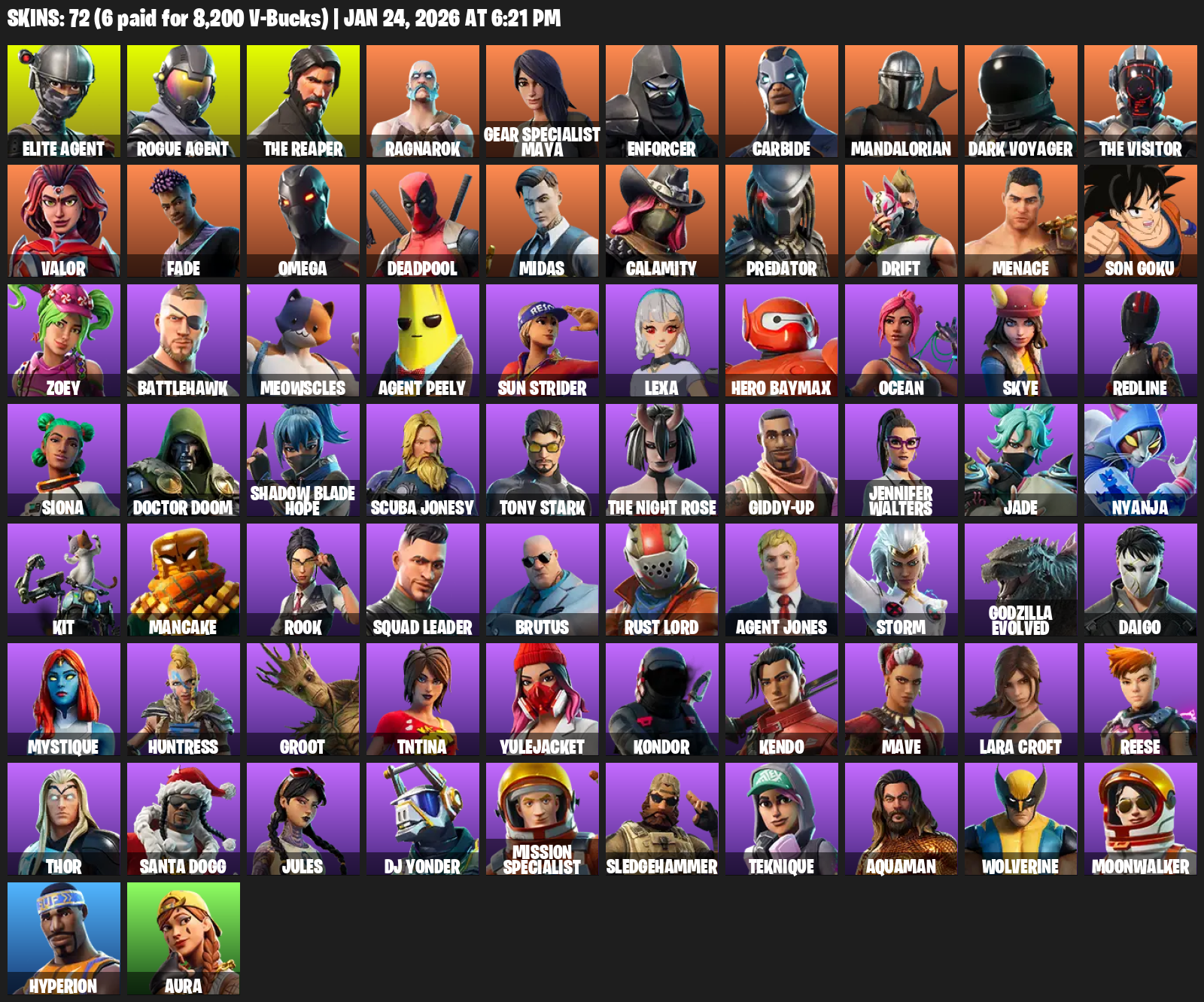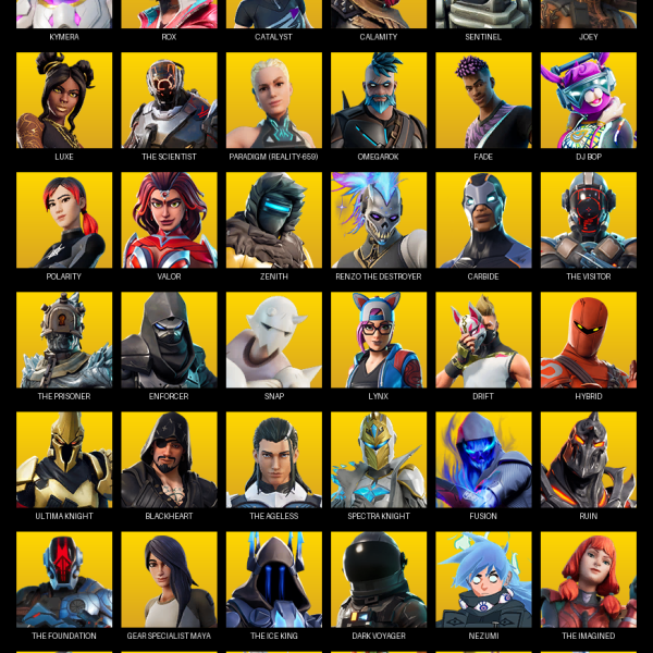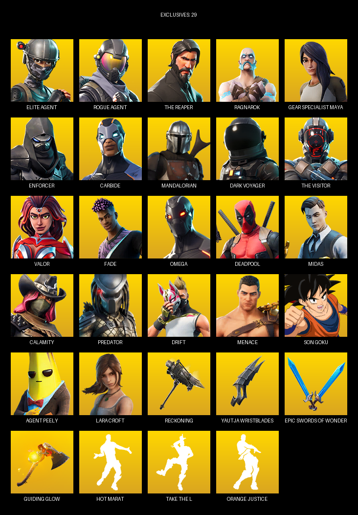Elite Agent, The Reaper, Gear Specialist Maya, Omega, Lara Croft, Ragnarok, Enforcer, Carbide, Mandalorian, Dark Voyager, Valor, Fade, Deadpool, Midas, Calamity, Predator, Drift, Menace