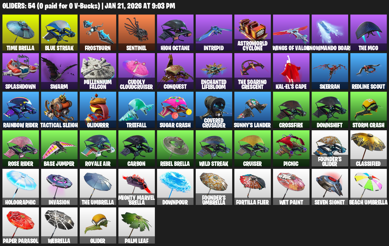 Time Brella, Frostburn, Sentinel, High Octane, Intrepid, Astroworld Cyclone, Snowmando Board, Splashdown, Swarm, Millennium Falcon, Cuddly Cloudcruiser, Conquest, Enchanted Lifebloom, Kal-El’s Cape, Skerran, Redline Scout
