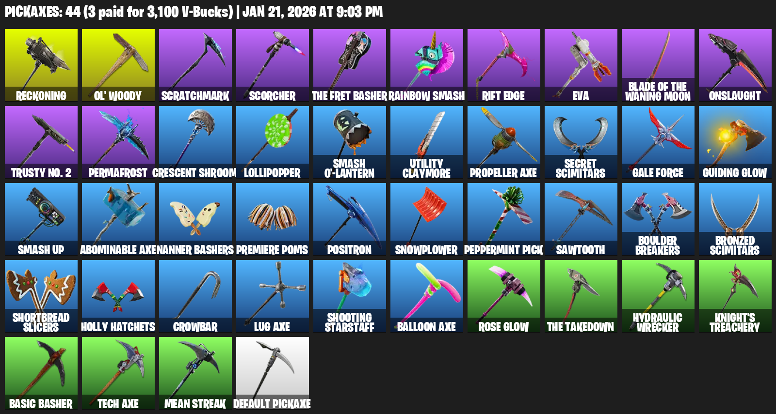 Reckoning, Ol’ Woody, Scratchmark, Scorcher, Rainbow Smash, Rift Edge, EVA, Onslaught, Trusty No. 2, Permafrost, Crescent Shroom, Lollipopper, Utility Claymore, Propeller Axe, Secret Scimitars, Gale Force, Guiding Glow