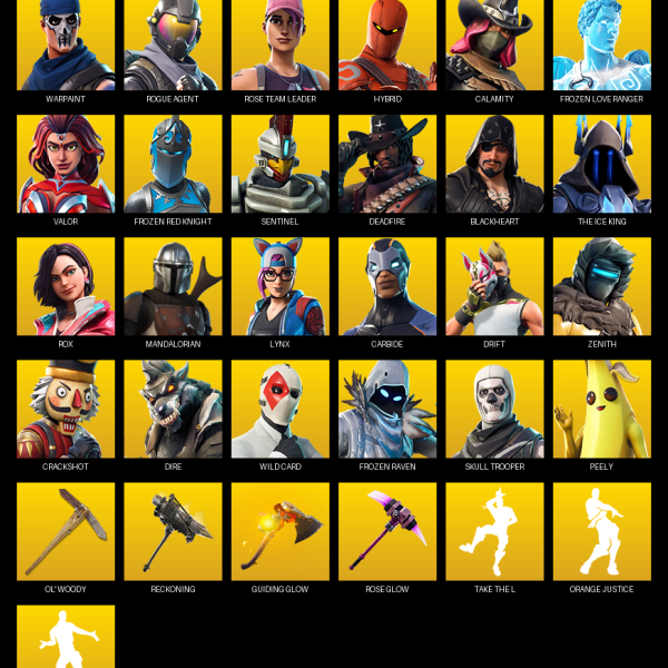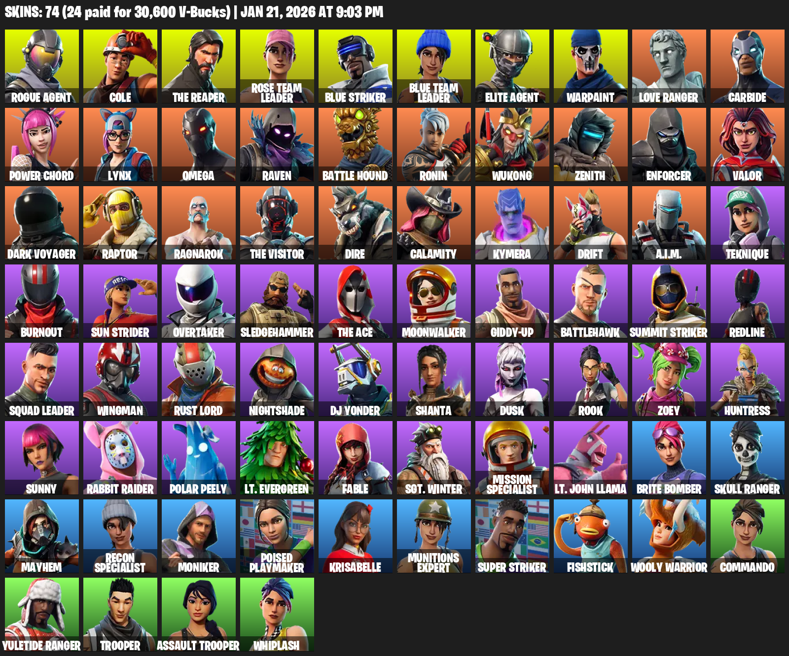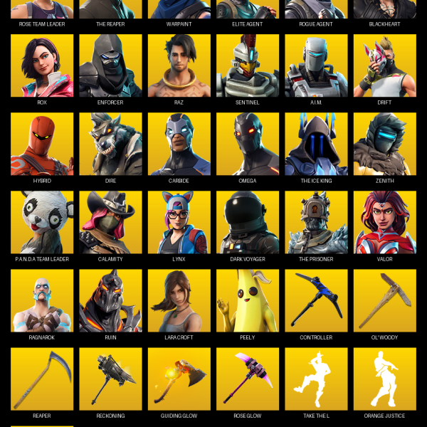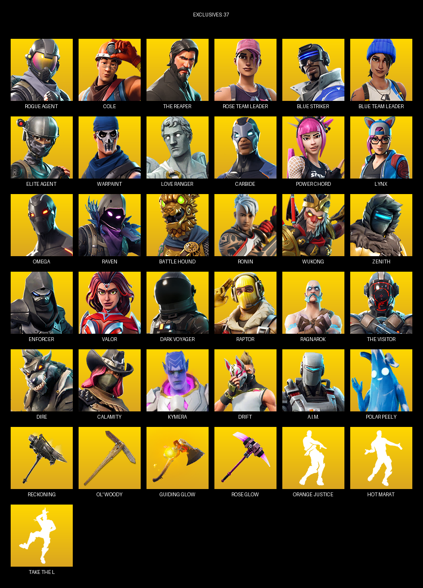 The Reaper, Elite Agent, Omega, Cole, Rose Team Leader, Blue Striker, Warpaint, Love Ranger, Carbide, Power Chord, Lynx, Raven, Battle Hound, Ronin, Wukong, Zenith, Enforcer, Valor