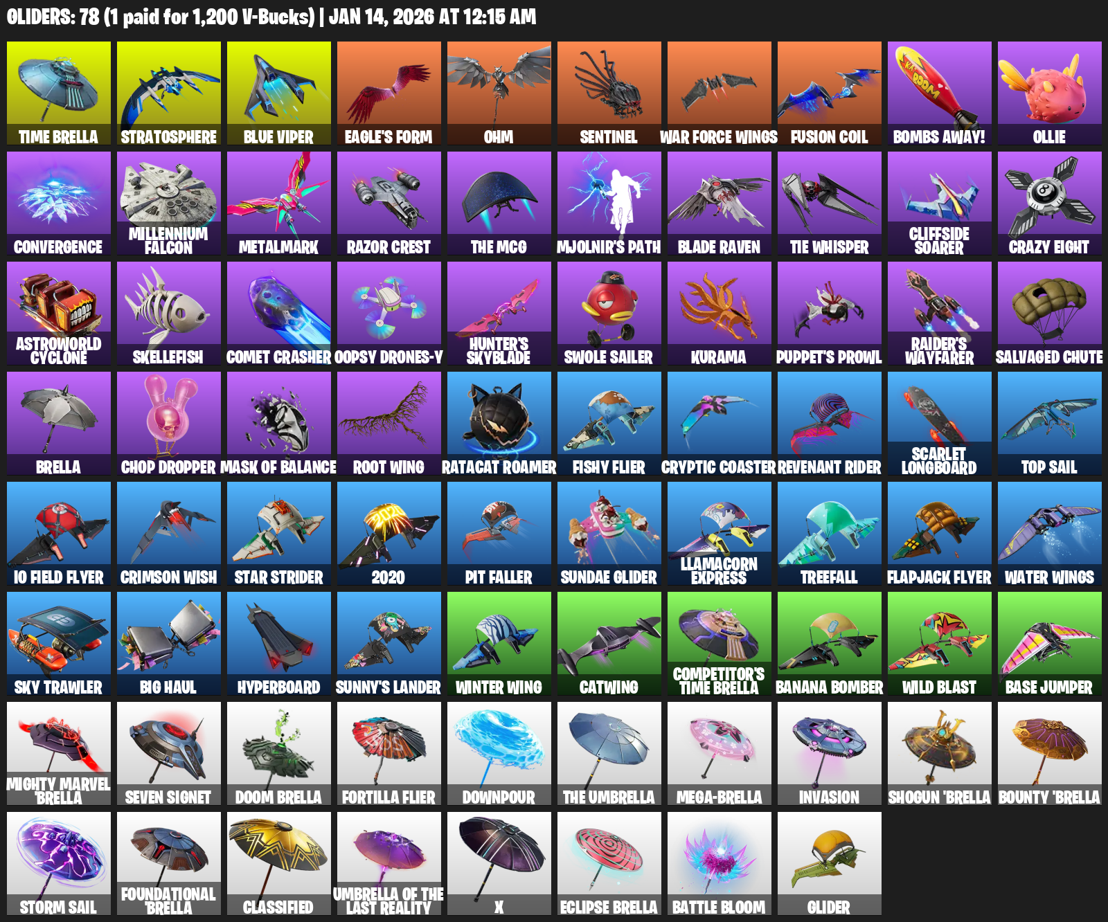 Time Brella, Stratosphere, Blue Viper, Eagle’s Form, Ohm, Sentinel, War Force Wings, Bombs Away!, Ollie, Convergence, Millennium Falcon, Metalmark, Razor Crest, Mjolnir’s Path, Blade Raven, TIE Whisper, Cliffside Soarer, Crazy Eight