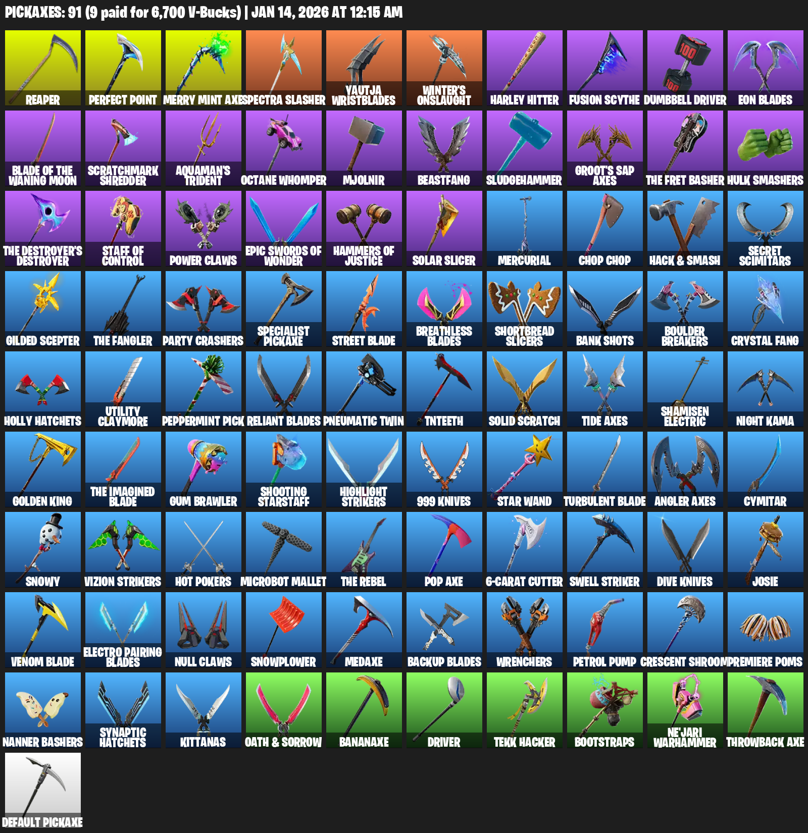 Merry Mint Axe, Reaper, Spectra Slasher, Yautja Wristblades, Winter’s Onslaught, Harley Hitter, Dumbbell Driver, Eon Blades, Scratchmark Shredder, Aquaman’s Trident, Octane Whomper, Mjolnir, Beastfang, Sludgehammer, Groot’s Sap Axes, Hulk Smashers
