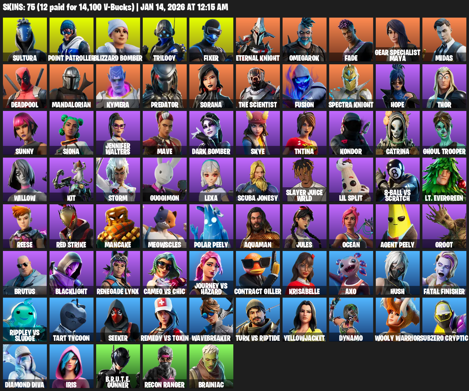[PC] | 75 skins | Merry Mint Axe | Sultura | Point Patroller | Blizzard Bomber | Trilogy | Fixer | Eternal Knight | Omegarok | Fade | #BRF9661