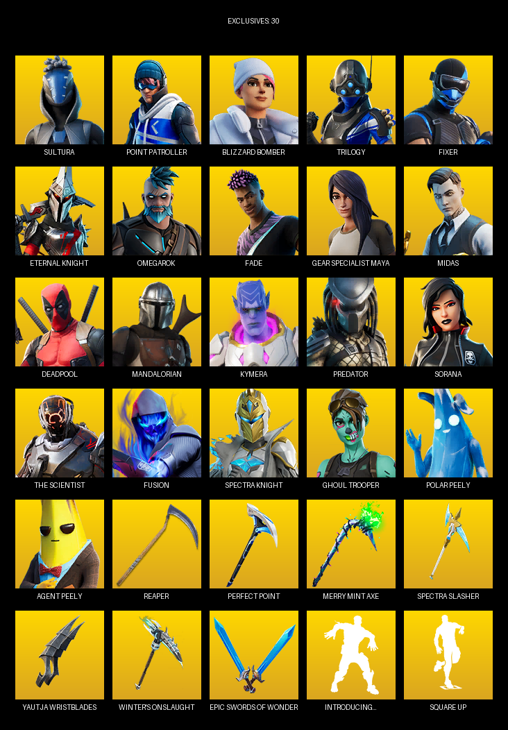 Point Patroller, Gear Specialist Maya, Sultura, Blizzard Bomber, Trilogy, Fixer, Eternal Knight, Omegarok, Fade, Midas, Deadpool, Mandalorian, Kymera, Predator, Sorana, The Scientist, Fusion, Hope, Thor