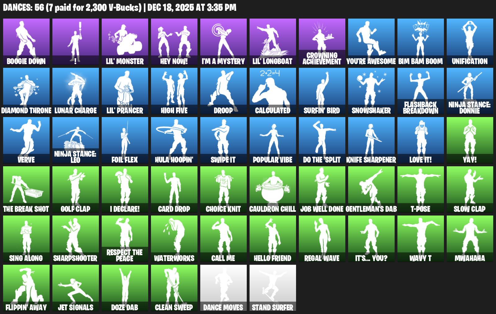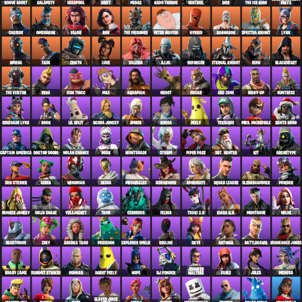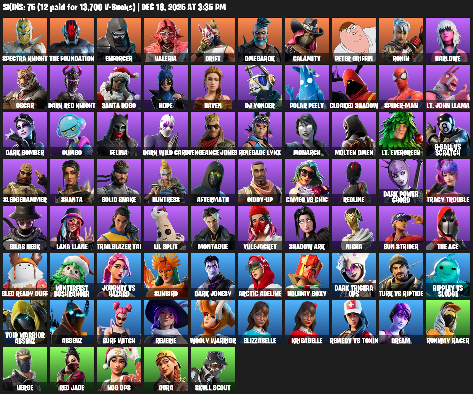 Spectra Knight, The Foundation, Enforcer, Valeria, Drift, Omegarok, Calamity, Peter Griffin, Ronin, Harlowe, Oscar, Santa Dogg, Hope, Haven, DJ Yonder, Polar Peely, Cloaked Shadow, Spider-Man, Lt. John Llama