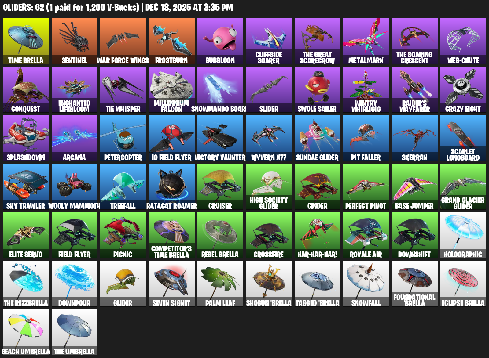 Time Brella, Sentinel, War Force Wings, Frostburn, Bubbloon, Cliffside Soarer, Metalmark, Conquest, Enchanted Lifebloom, TIE Whisper, Millennium Falcon, Snowmando Board, Slider, Swole Sailer, Wintry Whirligig, Raider’s Wayfarer, Crazy Eight