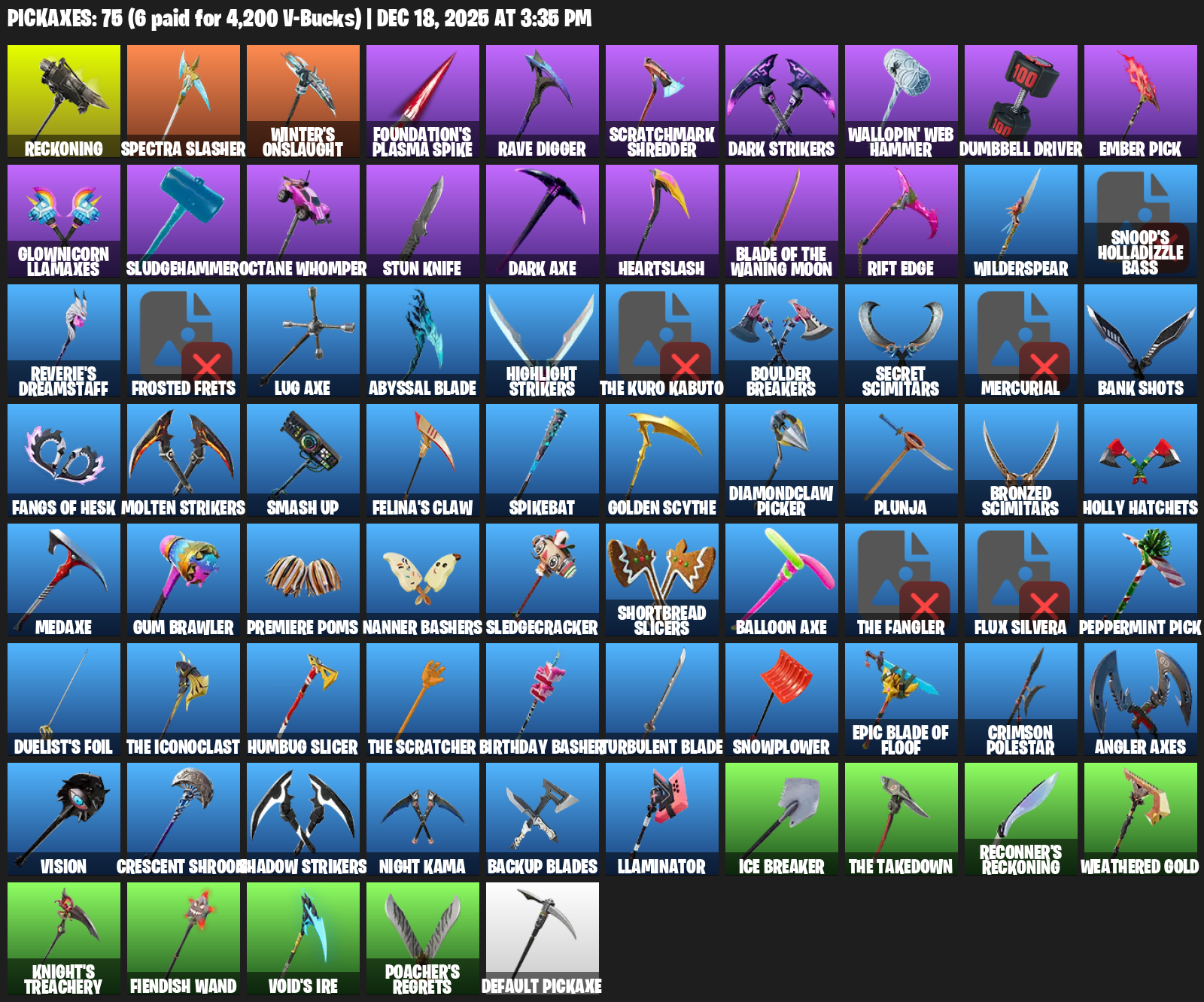 Reckoning, Winter’s Onslaught, Foundation’s Plasma Spike, Rave Digger, Scratchmark Shredder, Dark Strikers, Wallopin’ Web Hammer, Dumbbell Driver, Ember Pick, Glownicorn Llamaxes, Sludgehammer, Octane Whomper, Stun Knife, Heartslash, Rift Edge, Wilderspear, Snoop’s Holladizzle Bass