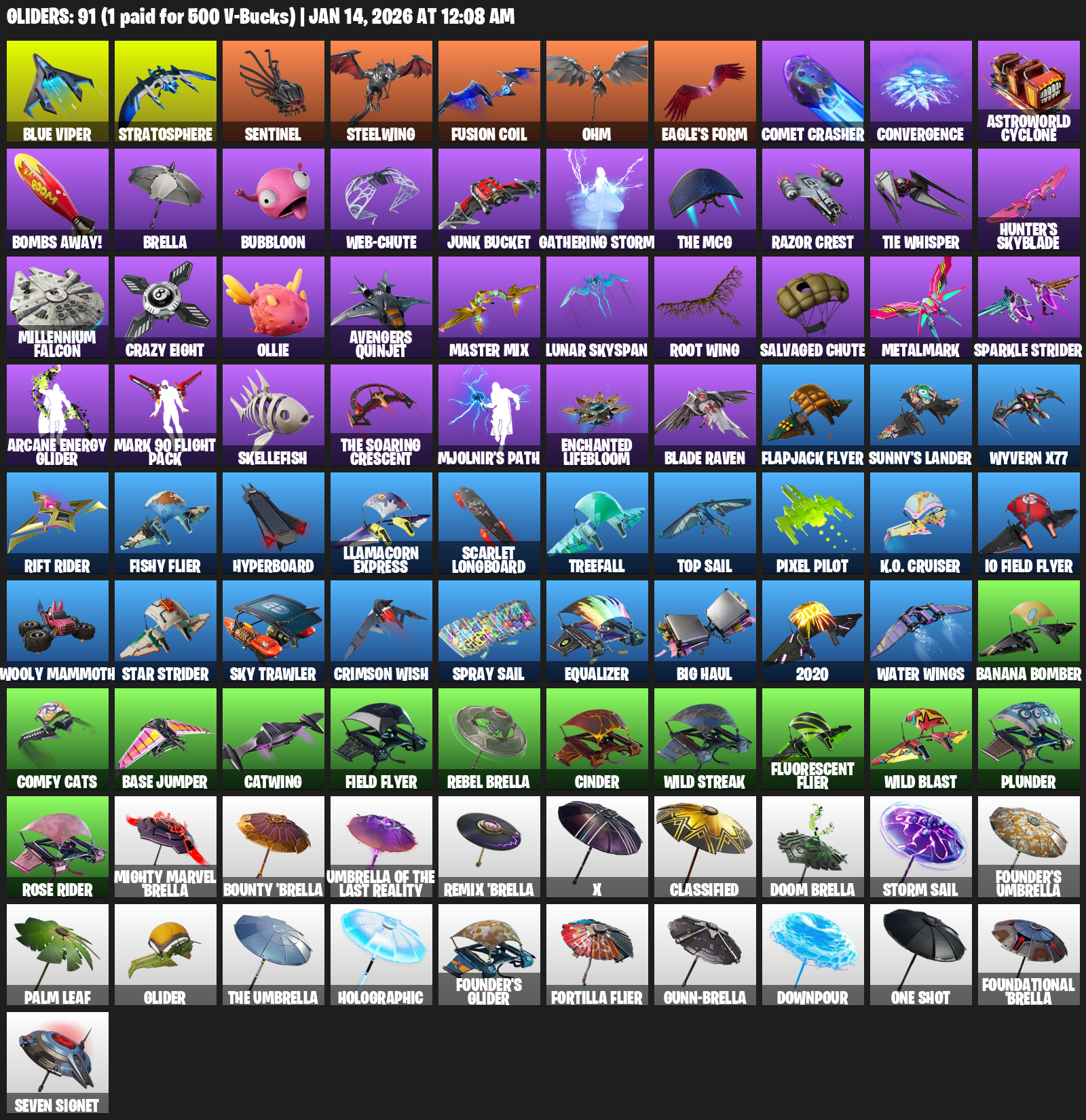 Blue Viper, Stratosphere, Sentinel, Steelwing, Ohm, Eagle’s Form, Comet Crasher, Convergence, Astroworld Cyclone, Bombs Away!, Brella, Bubbloon, Junk Bucket, Gathering Storm, Razor Crest, TIE Whisper, Hunter’s Skyblade