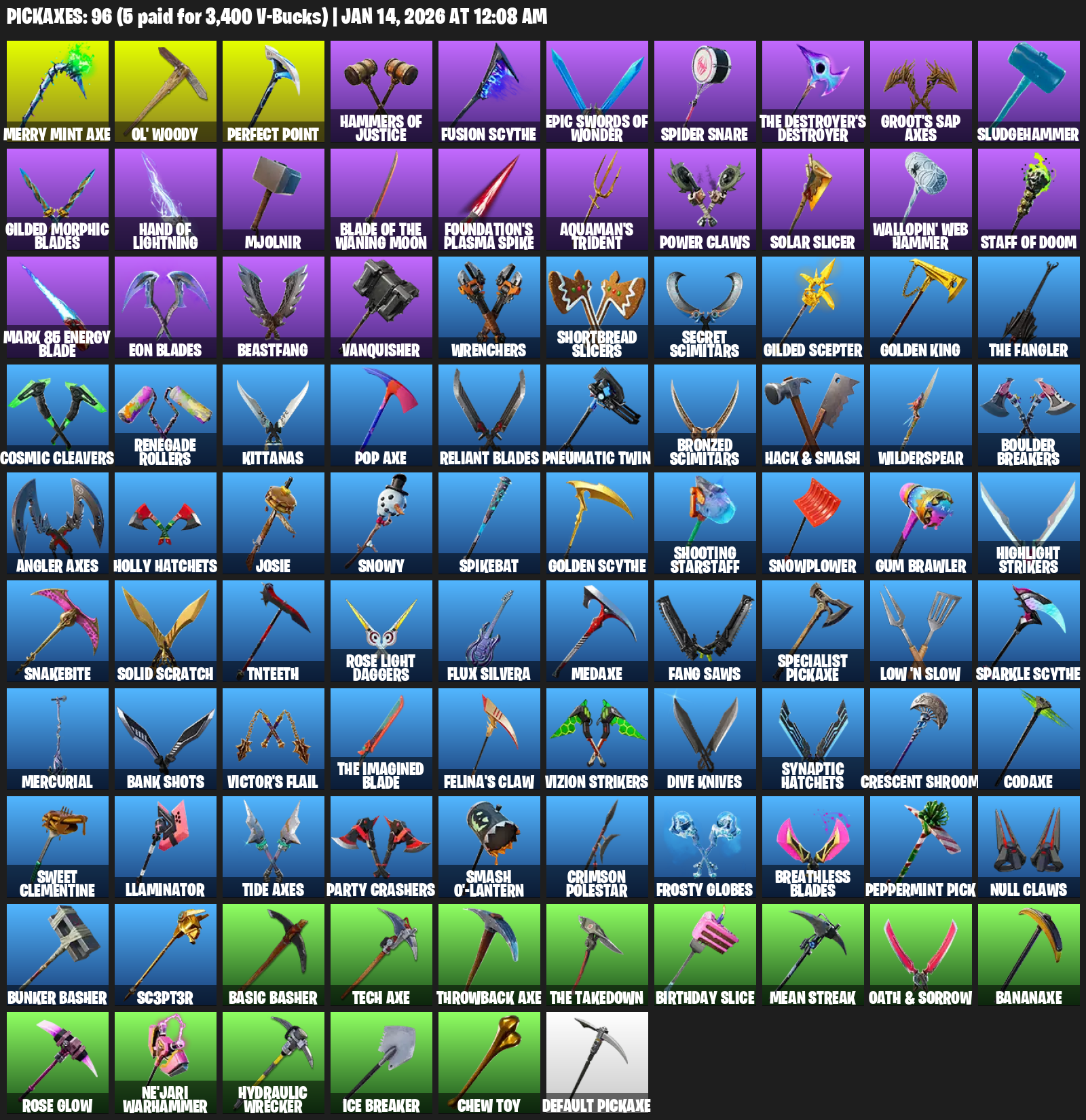 Merry Mint Axe, Ol’ Woody, Hammers of Justice, Spider Snare, Groot’s Sap Axes, Sludgehammer, Gilded Morphic Blades, Mjolnir, Foundation’s Plasma Spike, Aquaman’s Trident, Power Claws, Solar Slicer, Wallopin’ Web Hammer