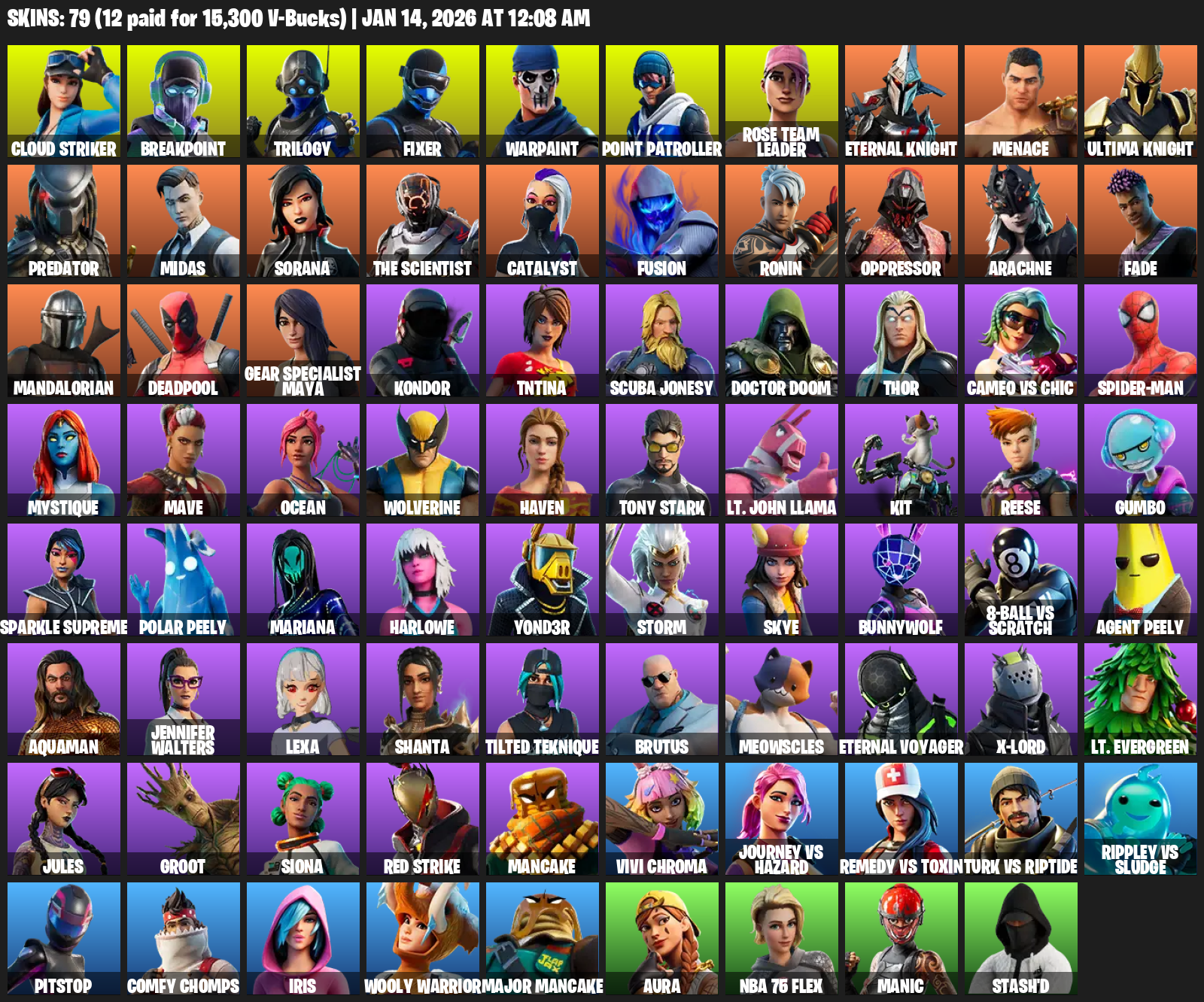 Point Patroller, Gear Specialist Maya, Cloud Striker, Breakpoint, Trilogy, Fixer, Warpaint, Rose Team Leader, Eternal Knight, Menace, Predator, Midas, Sorana, The Scientist, Catalyst, Fusion, Ronin, Oppressor, Arachne