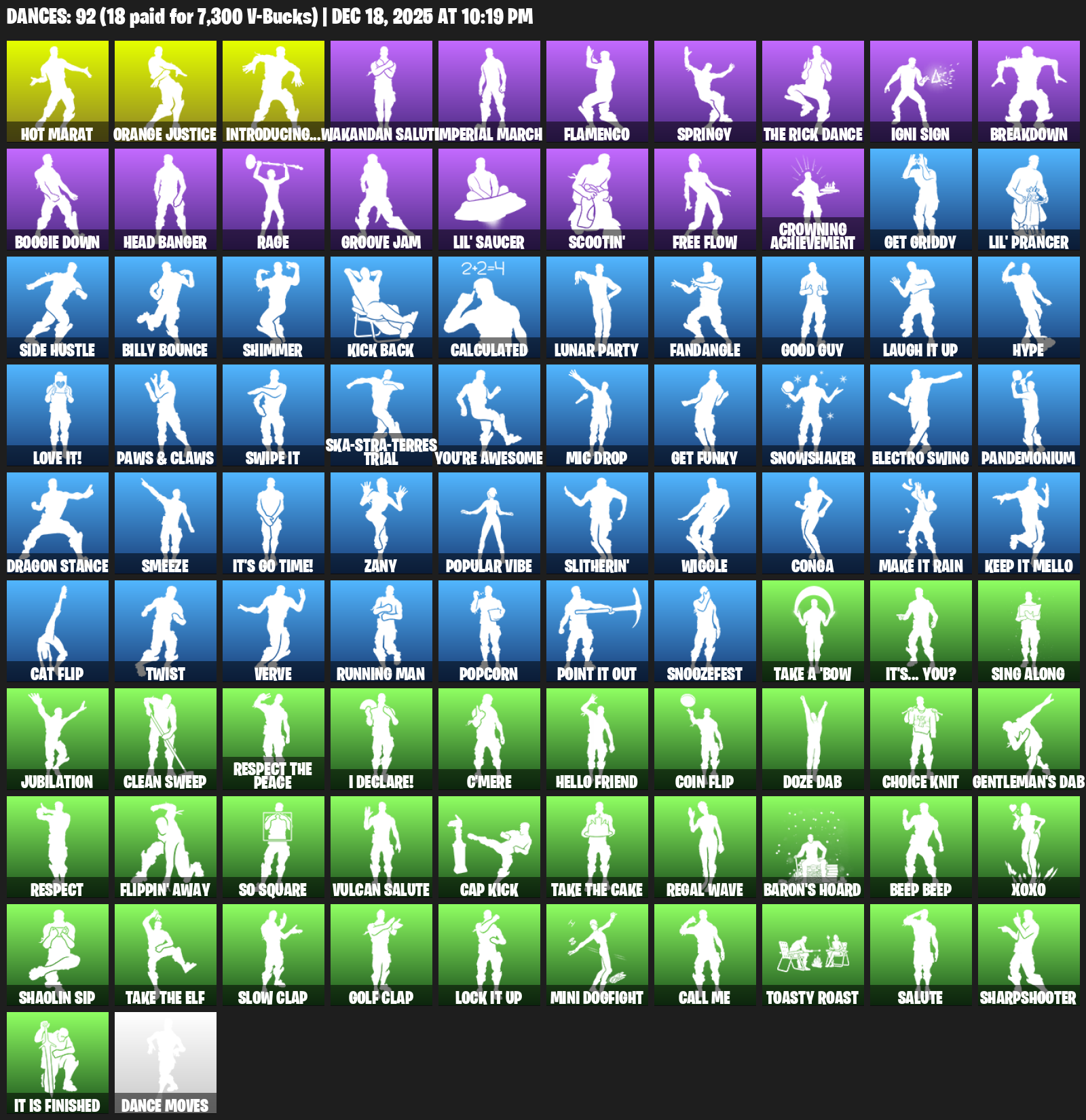 Hot Marat, Introducing…, Orange Justice, Wakandan Salute, Imperial March, Flamenco, Springy, Igni Sign, Breakdown, Boogie Down, Head Banger, Rage, Groove Jam, Lil’ Saucer, Scootin’, Free Flow, Crowning Achievement, Get Griddy