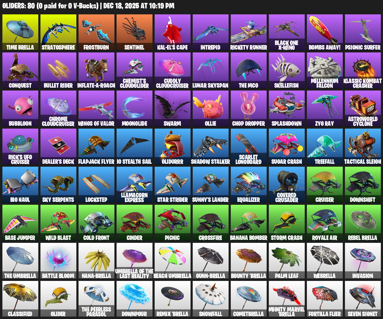 Time Brella, Stratosphere, Frostburn, Sentinel, Kal-El’s Cape, Intrepid, Rickety Runner, Black One X-wing, Bombs Away!, Psionic Surfer, Conquest, Bullet Rider, Inflate-A-Roach, Chemist’s Cloudglider, Cuddly Cloudcruiser, Lunar Skyspan, Skellefish, Millennium Falcon, Klassic Kombat Crasher