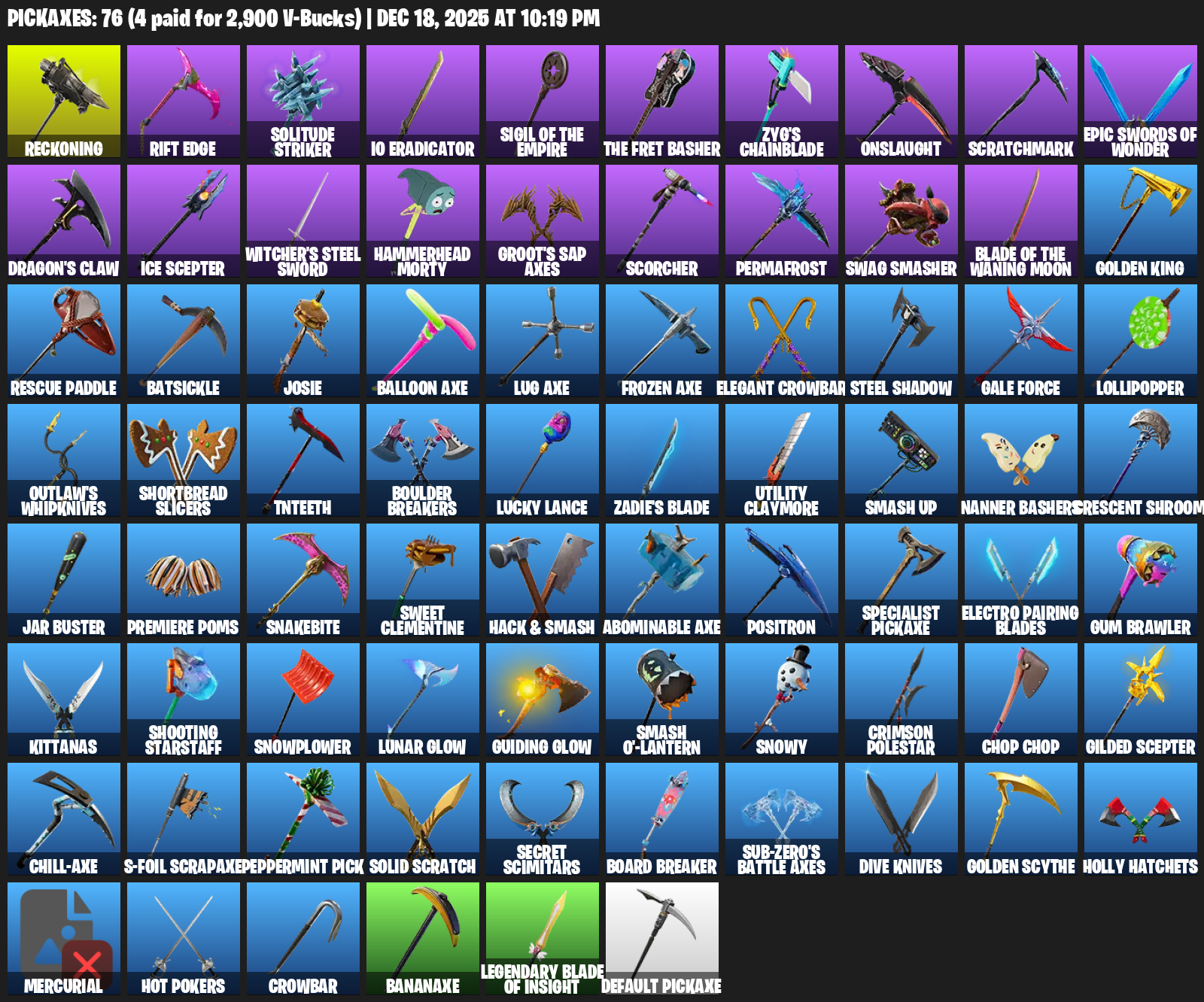 Reckoning, Rift Edge, Solitude Striker, IO Eradicator, Zyg’s Chainblade, Onslaught, Scratchmark, Dragon’s Claw, Ice Scepter, Witcher’s Steel Sword, Hammerhead Morty, Groot’s Sap Axes, Scorcher, Permafrost, Swag Smasher, Golden King