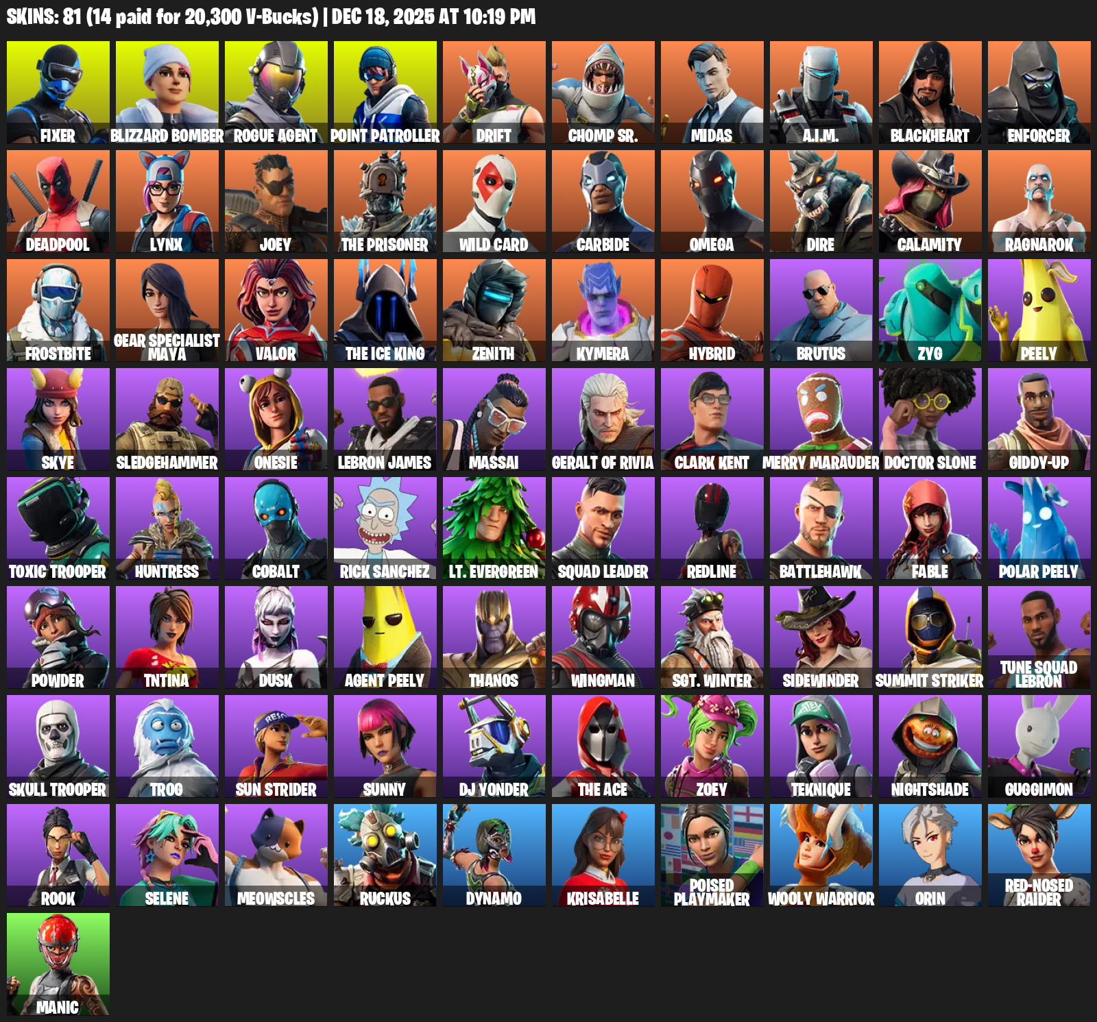 Point Patroller, Omega, Gear Specialist Maya, Fixer, Blizzard Bomber, Rogue Agent, Drift, Chomp Sr., Midas, A.I.M., Blackheart, Enforcer, Deadpool, Lynx, Joey, The Prisoner, Wild Card, Carbide, Dire, Calamity