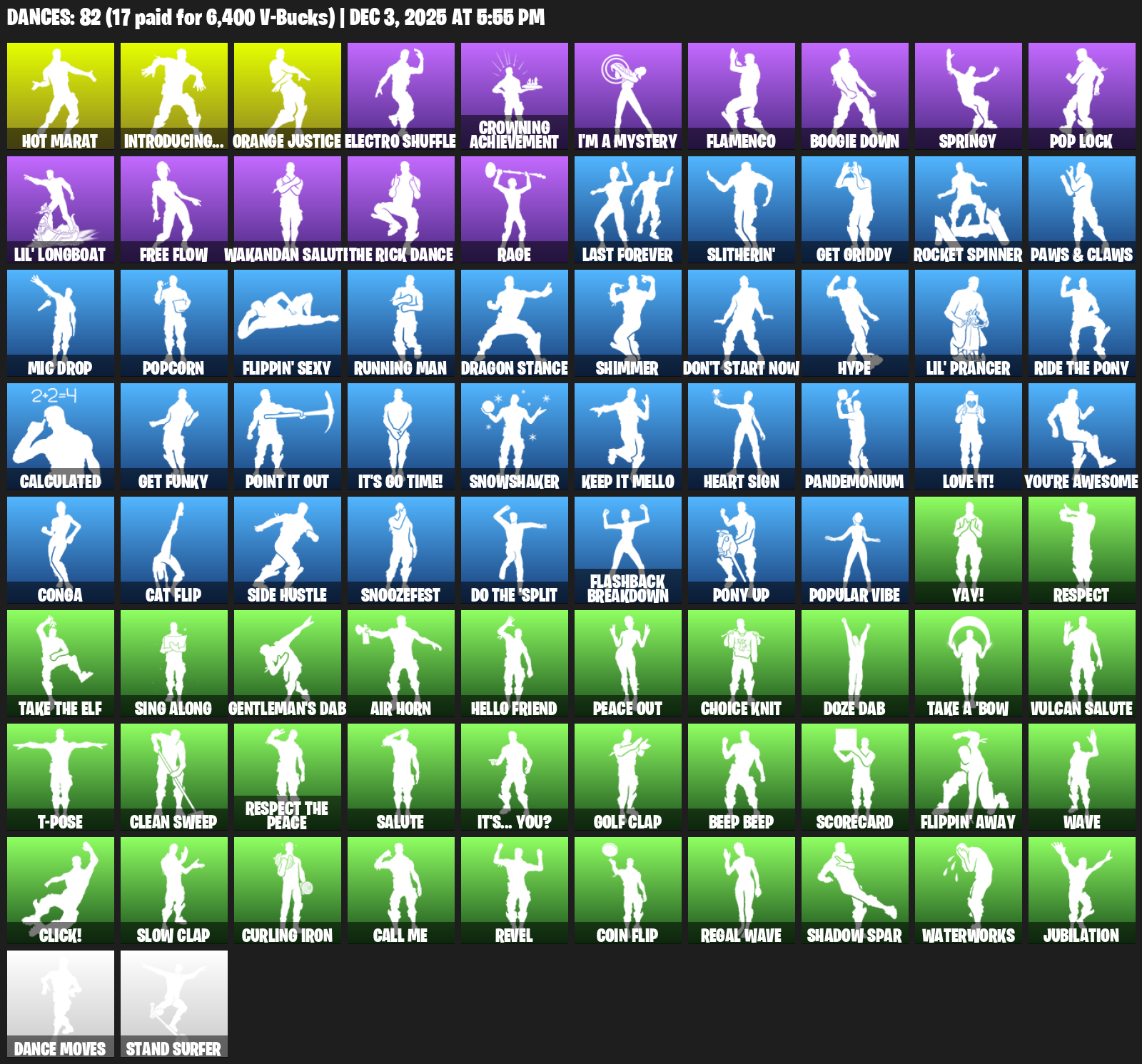 Introducing…, Orange Justice, Electro Shuffle, Crowning Achievement, I’m a Mystery, Flamenco, Boogie Down, Springy, Pop Lock, Lil’ Longboat, Free Flow, Wakandan Salute, Rage, Last Forever, Slitherin’, Get Griddy, Rocket Spinner, Paws & Claws