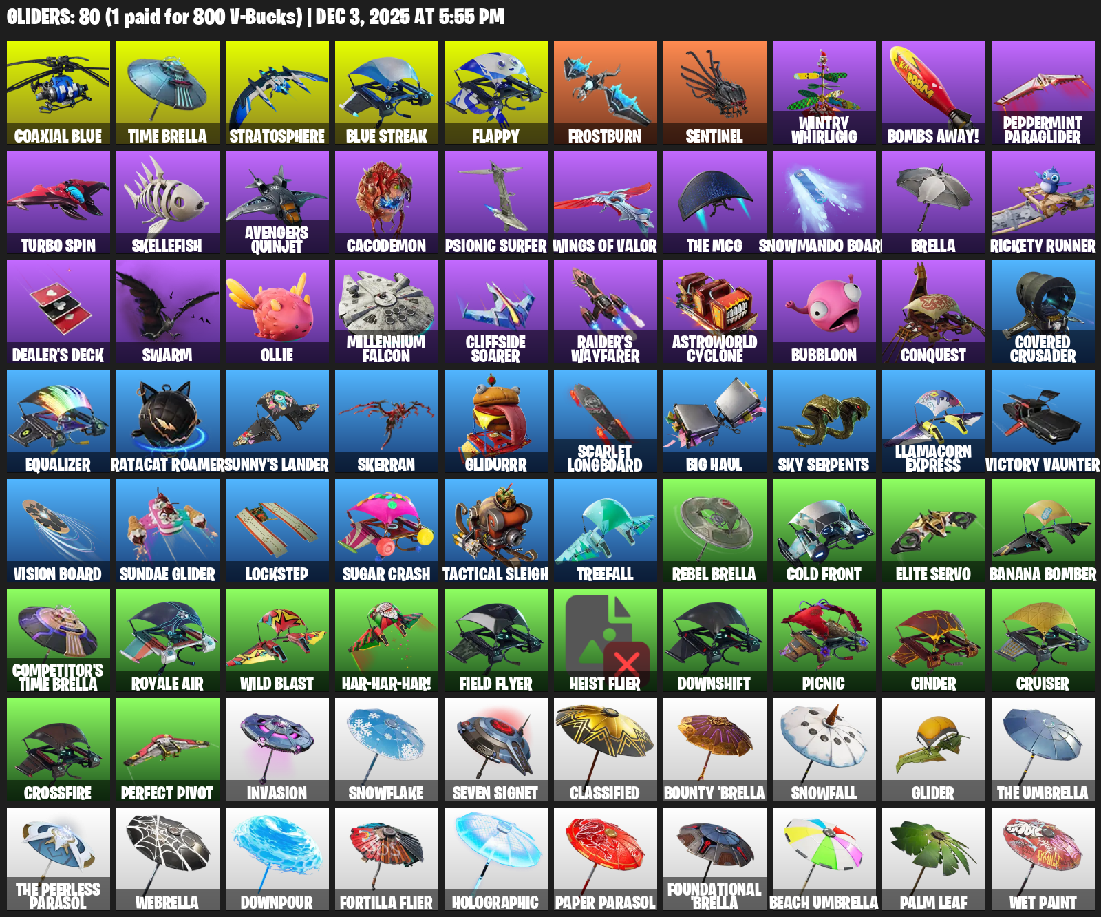 Time Brella, Stratosphere, Flappy, Frostburn, Wintry Whirligig, Bombs Away!, Peppermint Paraglider, Turbo Spin, Skellefish, Avengers Quinjet, Cacodemon, Psionic Surfer, Snowmando Board, Rickety Runner