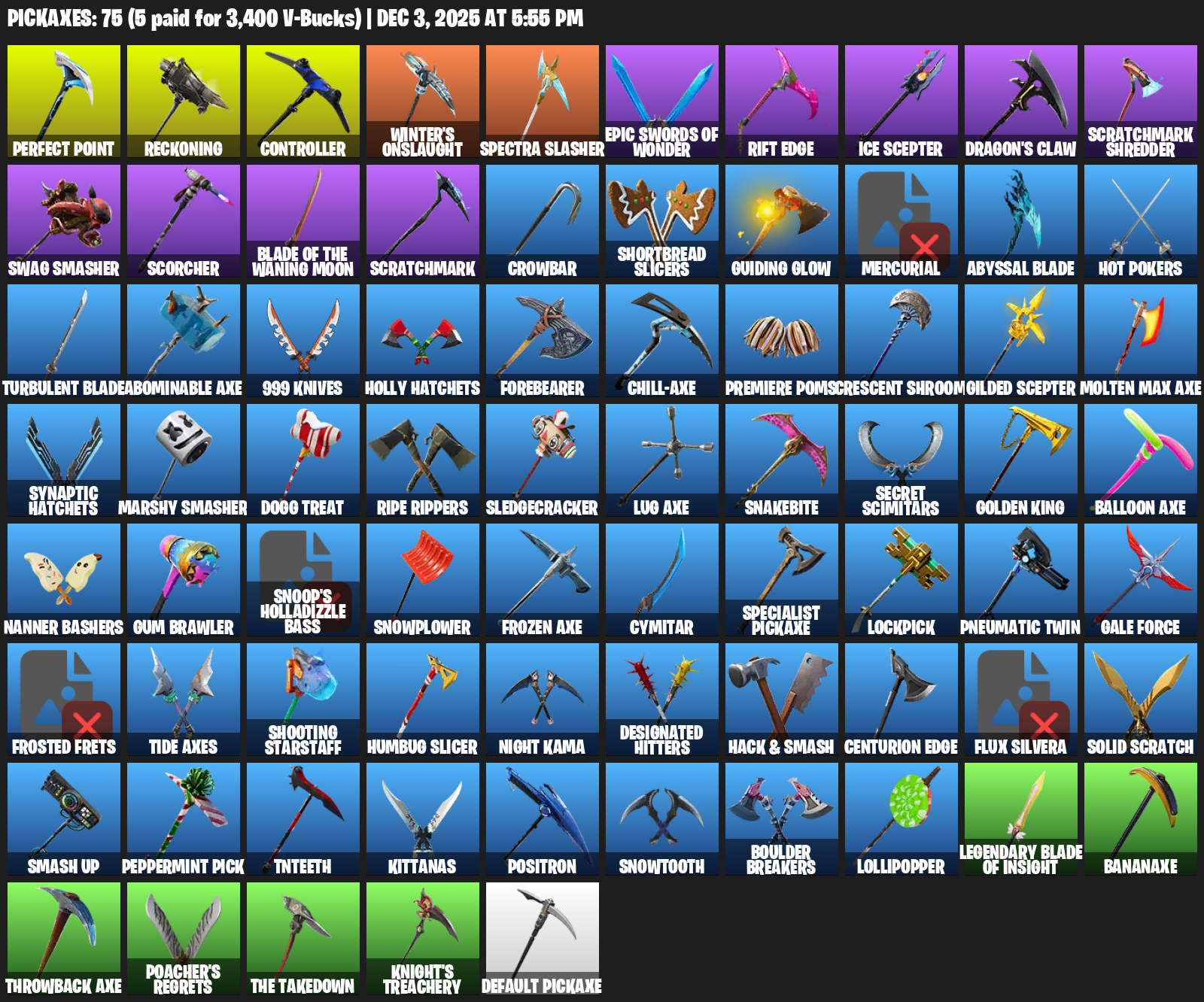 Reckoning, Controller, Winter’s Onslaught, Spectra Slasher, Rift Edge, Ice Scepter, Dragon’s Claw, Scratchmark Shredder, Swag Smasher, Scorcher, Blade of the Waning Moon, Crowbar, Shortbread Slicers, Guiding Glow, Mercurial, Hot Pokers