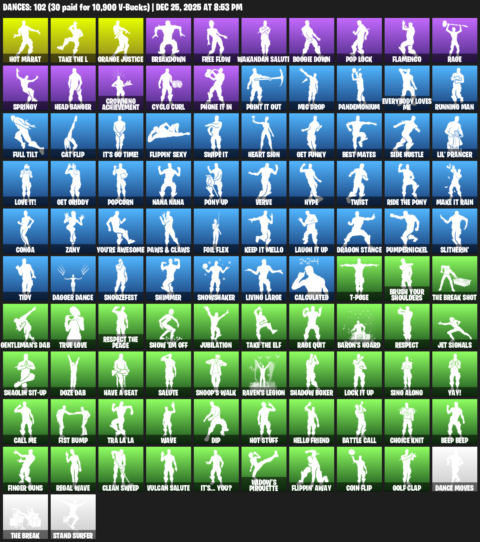 Hot Marat, Orange Justice, Breakdown, Free Flow, Wakandan Salute, Boogie Down, Pop Lock, Flamenco, Rage, Springy, Head Banger, Crowning Achievement, Cyclo Curl, Phone It In, Mic Drop, Pandemonium, Everybody Loves Me, Running Man