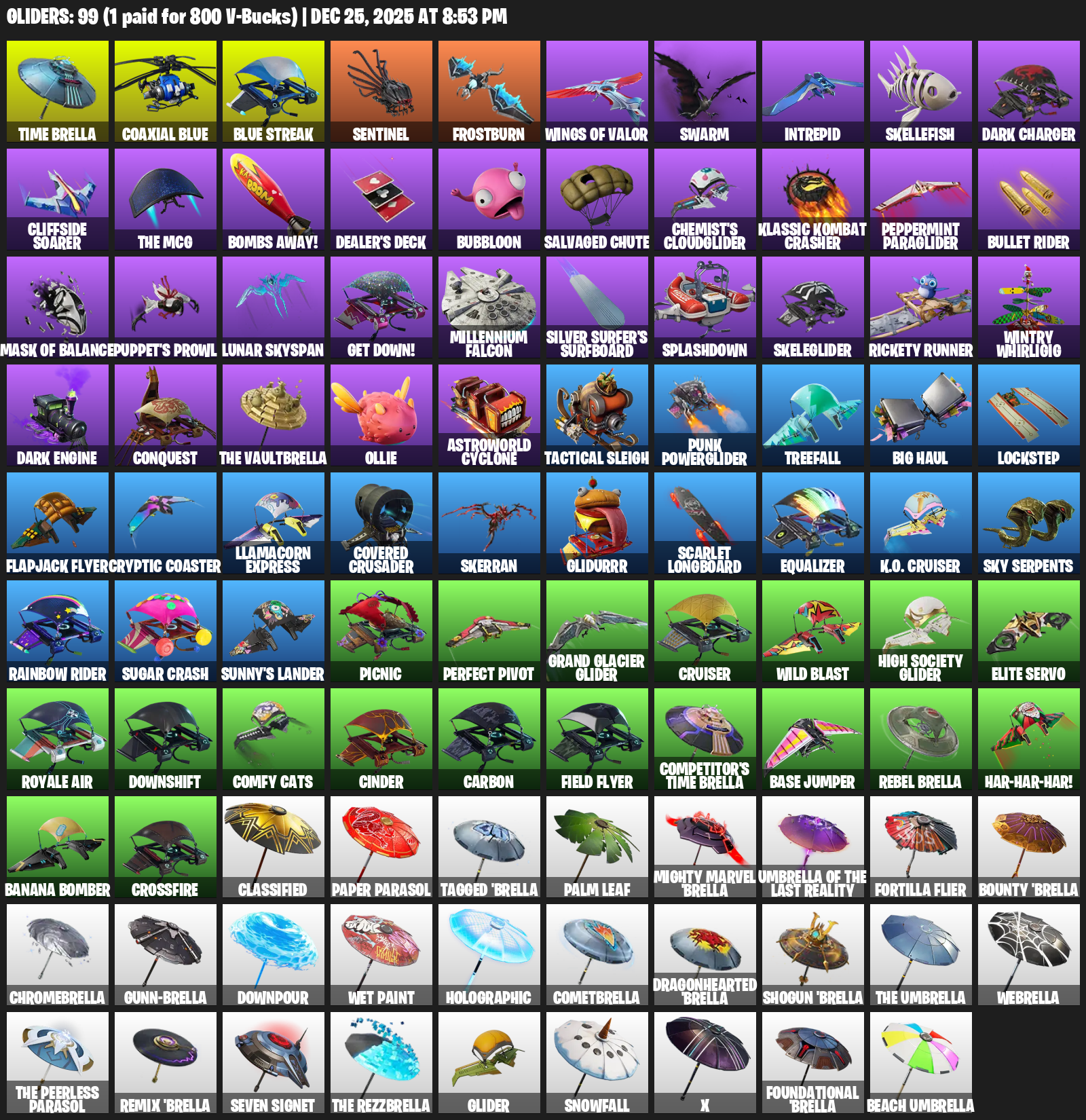 Time Brella, Sentinel, Frostburn, Wings of Valor, Swarm, Intrepid, Skellefish, Dark Charger, Cliffside Soarer, Bombs Away!, Dealer’s Deck, Bubbloon, Salvaged Chute, Chemist’s Cloudglider, Klassic Kombat Crasher, Peppermint Paraglider, Bullet Rider