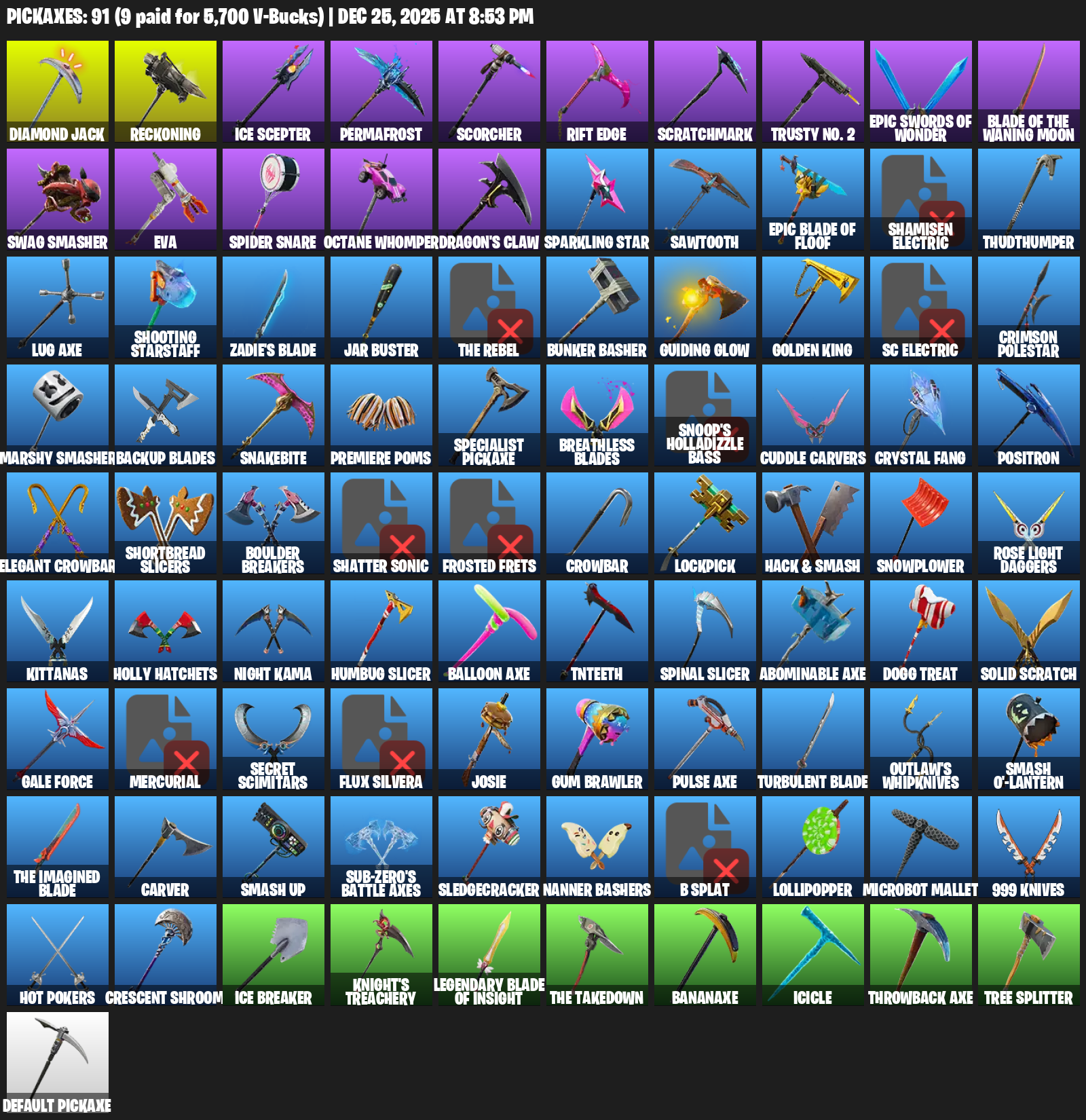 Diamond Jack, Reckoning, Permafrost, Scorcher, Rift Edge, Scratchmark, Trusty No. 2, Swag Smasher, EVA, Spider Snare, Octane Whomper, Dragon’s Claw, Sparkling Star, Sawtooth, Shamisen Electric, Thudthumper