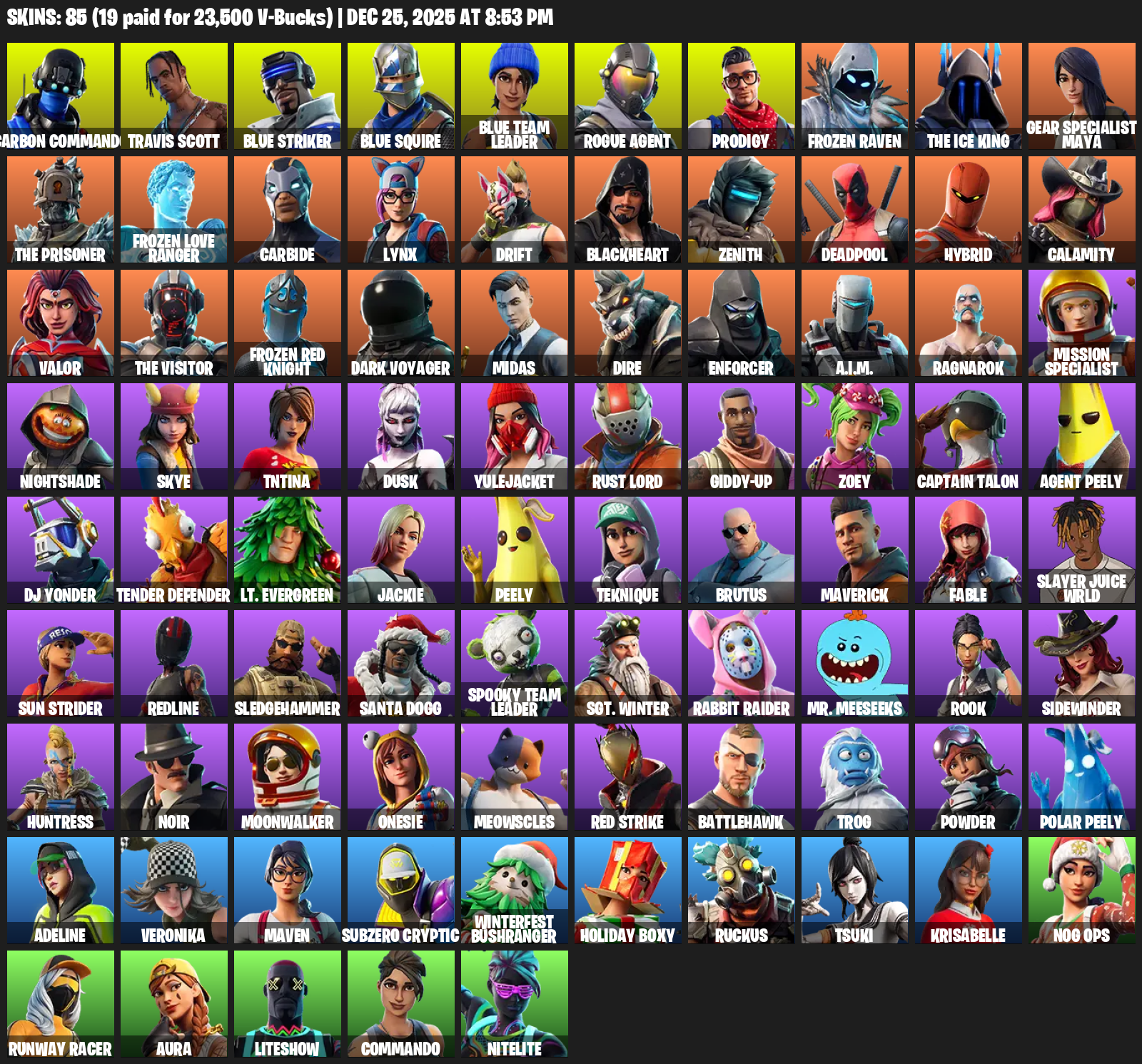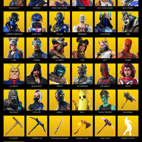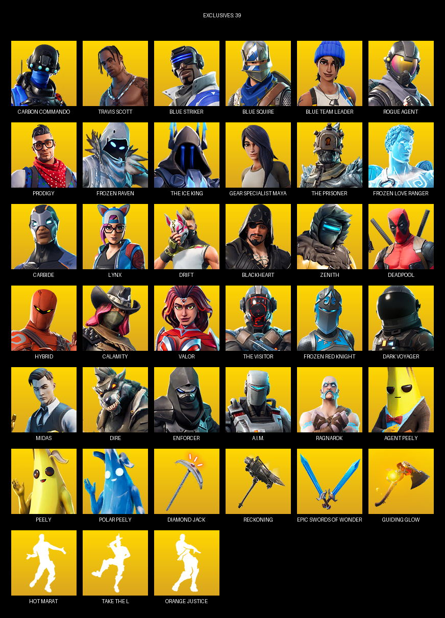Travis Scott, Blue Squire, Gear Specialist Maya, Carbon Commando, Rogue Agent, Prodigy, Frozen Raven, The Ice King, Carbide, Lynx, Drift, Blackheart, Zenith, Deadpool, Hybrid, Calamity