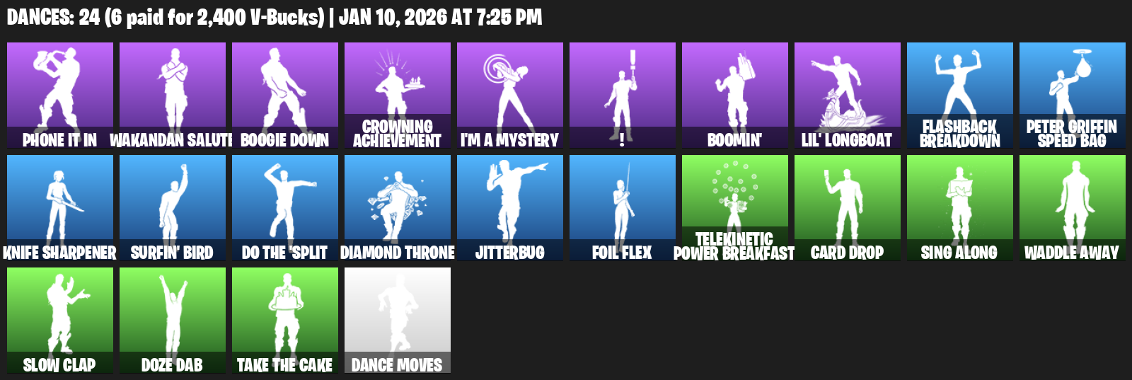 Phone It In, Wakandan Salute, Boogie Down, Crowning Achievement, I’m a Mystery, !, Boomin’, Lil’ Longboat, Flashback Breakdown, Surfin’ Bird, Do the ‘Split, Diamond Throne, Jitterbug, Foil Flex, Telekinetic Power Breakfast, Card Drop, Sing Along, Waddle Away