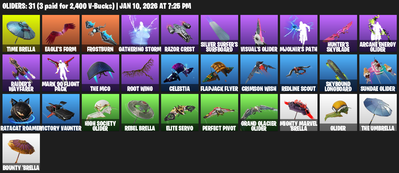 Time Brella, Eagle’s Form, Frostburn, Gathering Storm, Razor Crest, Silver Surfer’s Surfboard, Visual’s Glider, Mjolnir’s Path, Hunter’s Skyblade, Raider’s Wayfarer, Mark 90 Flight Pack, Root Wing, Celestia, Flapjack Flyer, Crimson Wish, Skybound Longboard