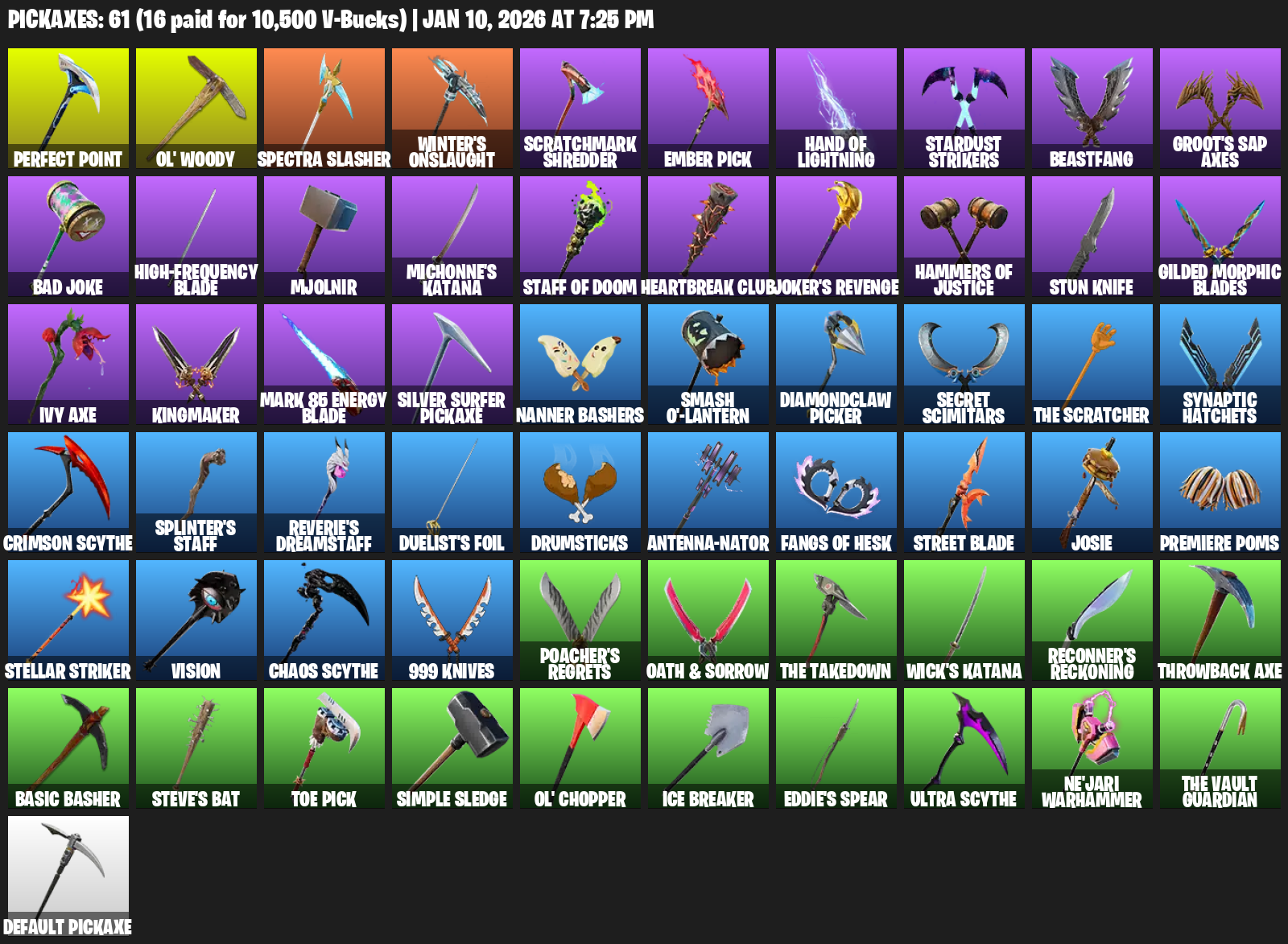 Perfect Point, Ol’ Woody, Winter’s Onslaught, Scratchmark Shredder, Ember Pick, Hand of Lightning, Stardust Strikers, Beastfang, Groot’s Sap Axes, Bad Joke, High-frequency Blade, Mjolnir, Michonne’s Katana, Heartbreak Club, Joker’s Revenge, Stun Knife, Gilded Morphic Blades