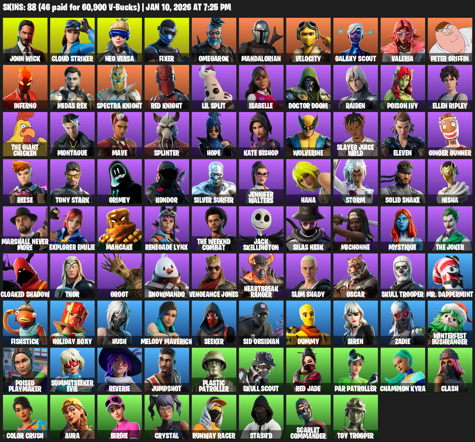 John Wick, Cloud Striker, Neo Versa, Fixer, Omegarok, Mandalorian, Velocity, Galaxy Scout, Valeria, Peter Griffin, Inferno, Midas Rex, Spectra Knight, Lil Split, Isabelle, Doctor Doom, Raiden, Poison Ivy, Ellen Ripley
