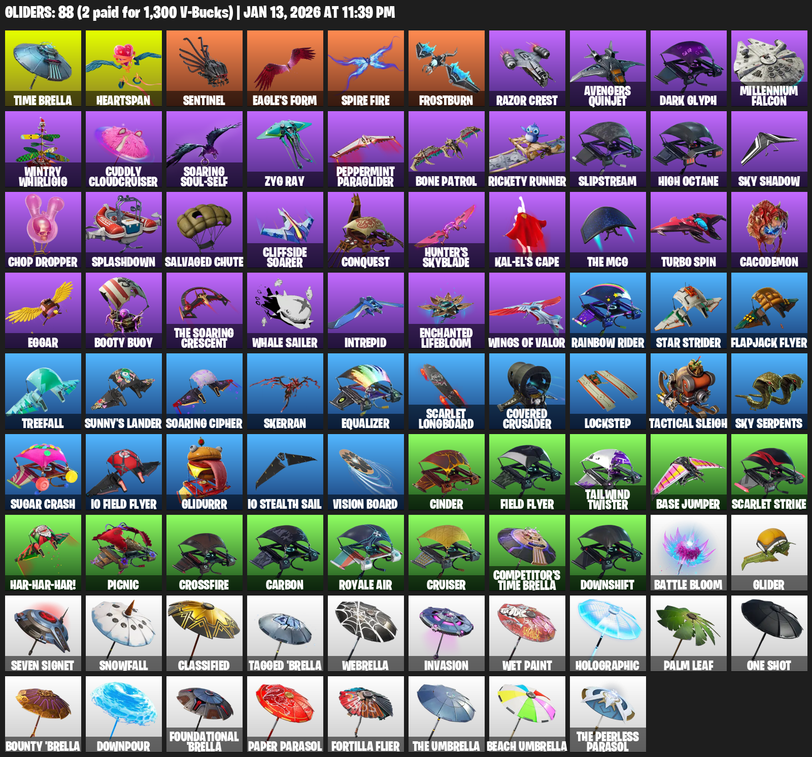 Time Brella, Heartspan, Frostburn, Razor Crest, Avengers Quinjet, Dark Glyph, Millennium Falcon, Wintry Whirligig, Cuddly Cloudcruiser, Soaring Soul-Self, Zyg Ray, Peppermint Paraglider, Bone Patrol, Rickety Runner, Slipstream, High Octane