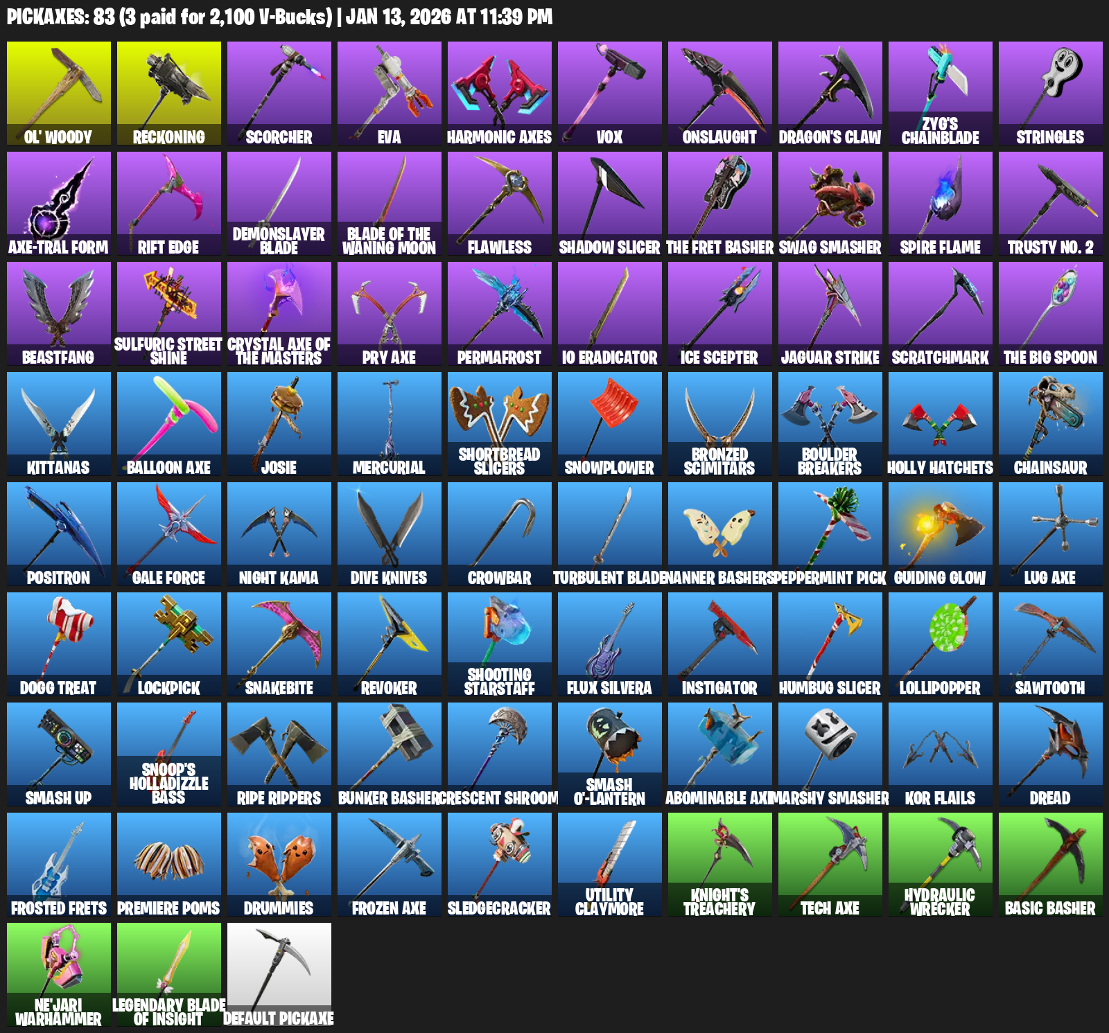 Ol’ Woody, Reckoning, Scorcher, EVA, Harmonic Axes, Vox, Onslaught, Dragon’s Claw, Zyg’s Chainblade, Stringles, Axe-tral Form, Rift Edge, Demonslayer Blade, Flawless, Shadow Slicer, Swag Smasher, Spire Flame, Trusty No. 2