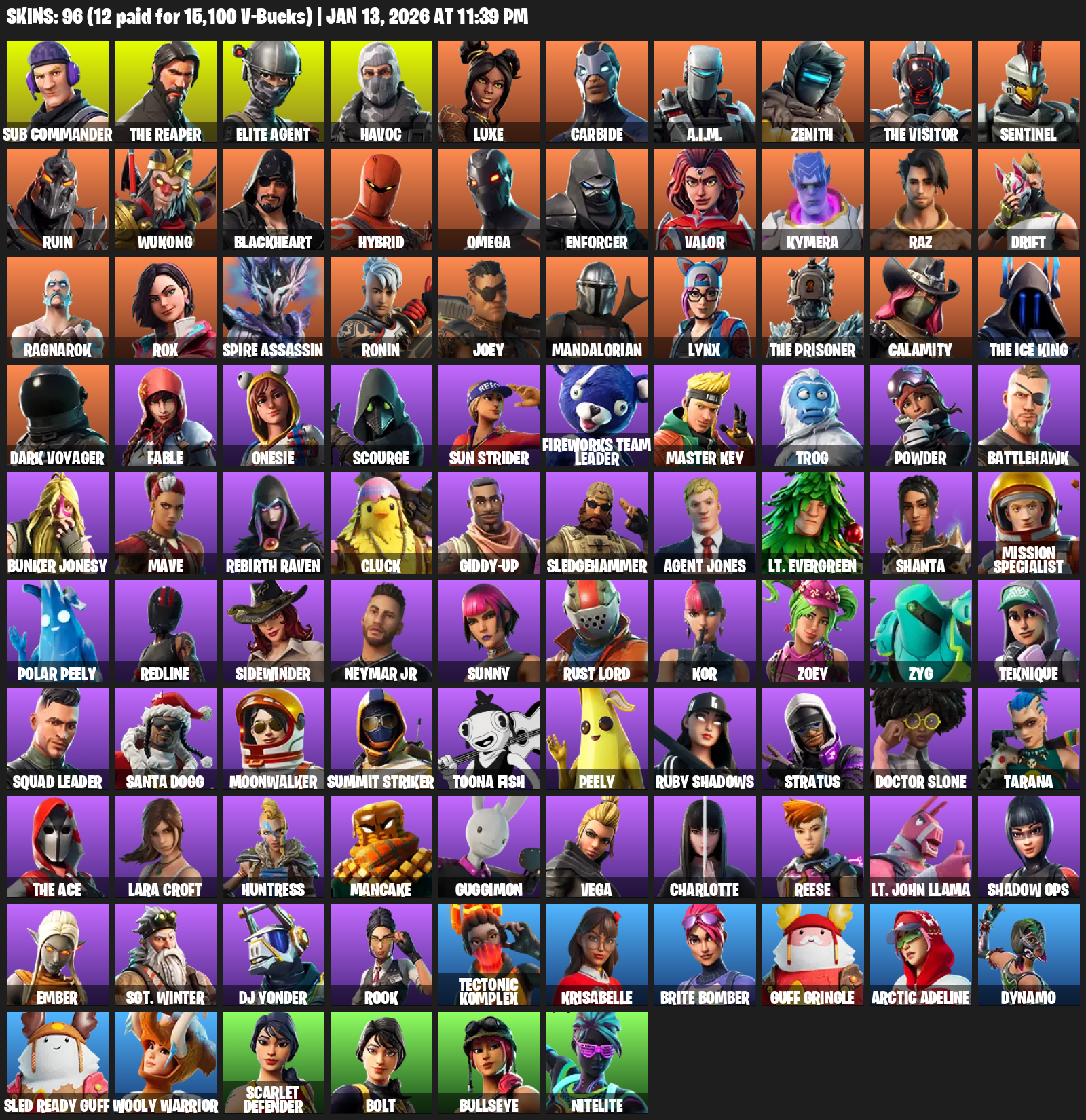 The Reaper, Elite Agent, Omega, Lara Croft, Sub Commander, Havoc, Luxe, Carbide, A.I.M., Zenith, Sentinel, Ruin, Wukong, Blackheart, Hybrid, Enforcer, Valor, Kymera, Raz