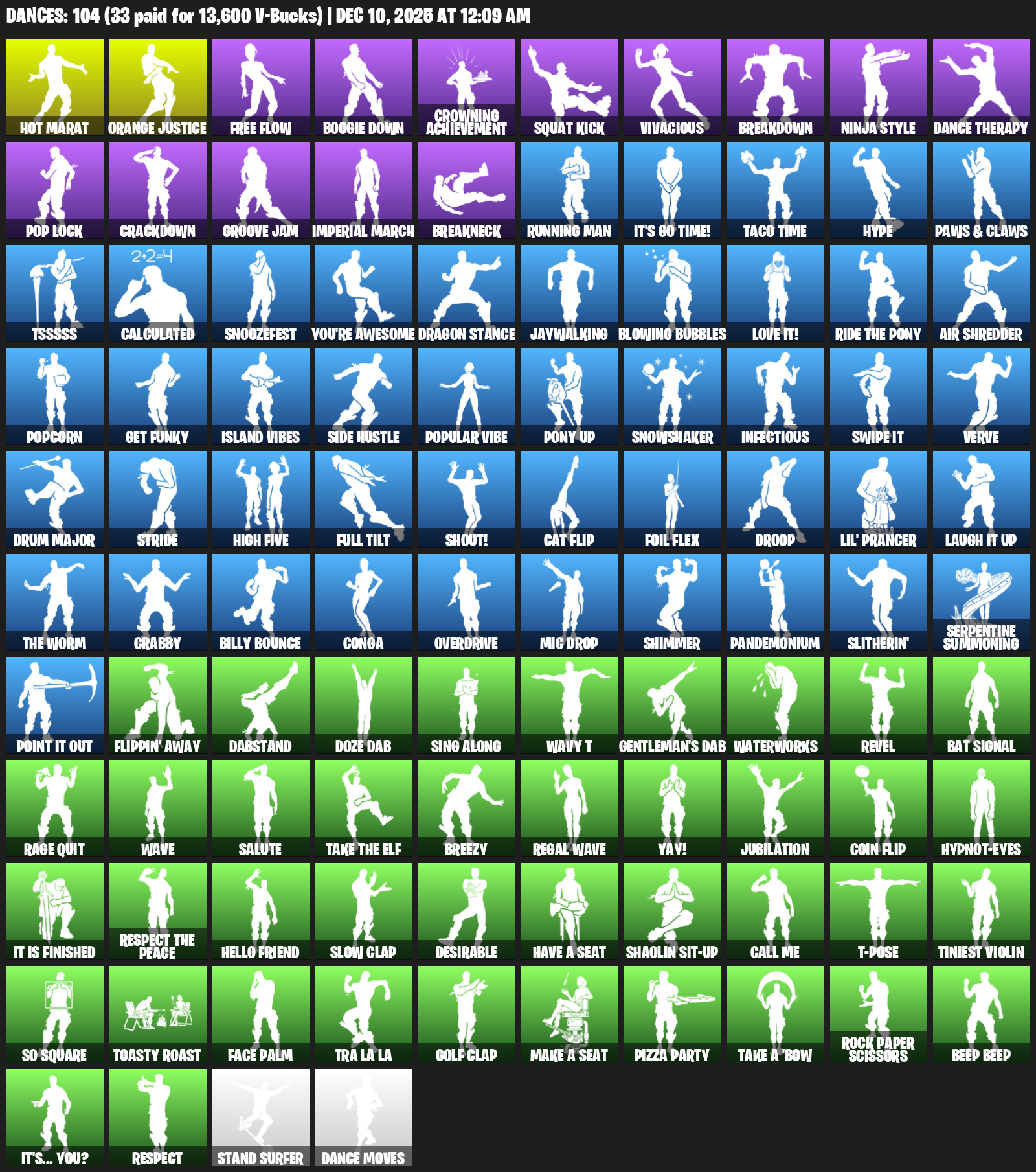 Hot Marat, Orange Justice, Free Flow, Boogie Down, Crowning Achievement, Squat Kick, Vivacious, Breakdown, Ninja Style, Dance Therapy, Pop Lock, Crackdown, Groove Jam, Imperial March, Breakneck, Running Man, It’s Go Time!, Taco Time, Hype, Paws & Claws