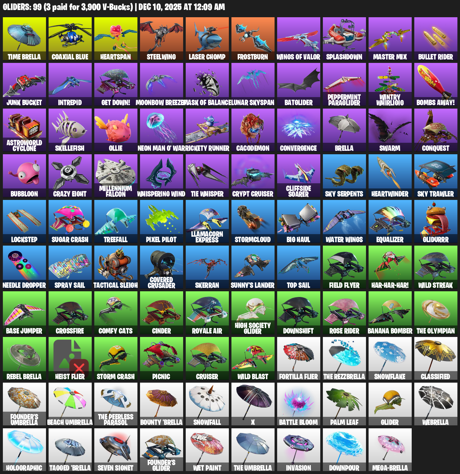 Heartspan, Steelwing, Frostburn, Splashdown, Master Mix, Bullet Rider, Junk Bucket, Intrepid, Get Down!, Moonbow Breezer, Mask of Balance, Lunar Skyspan, Batglider, Peppermint Paraglider, Wintry Whirligig, Bombs Away!