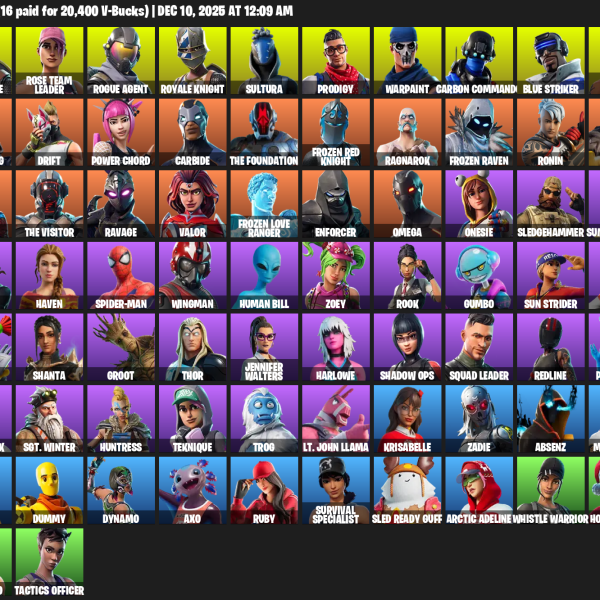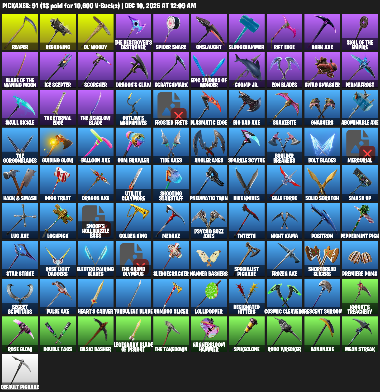 Reaper, Reckoning, Ol’ Woody, Spider Snare, Onslaught, Sludgehammer, Rift Edge, Dark Axe, Scorcher, Dragon’s Claw, Scratchmark, Eon Blades, Swag Smasher, Permafrost