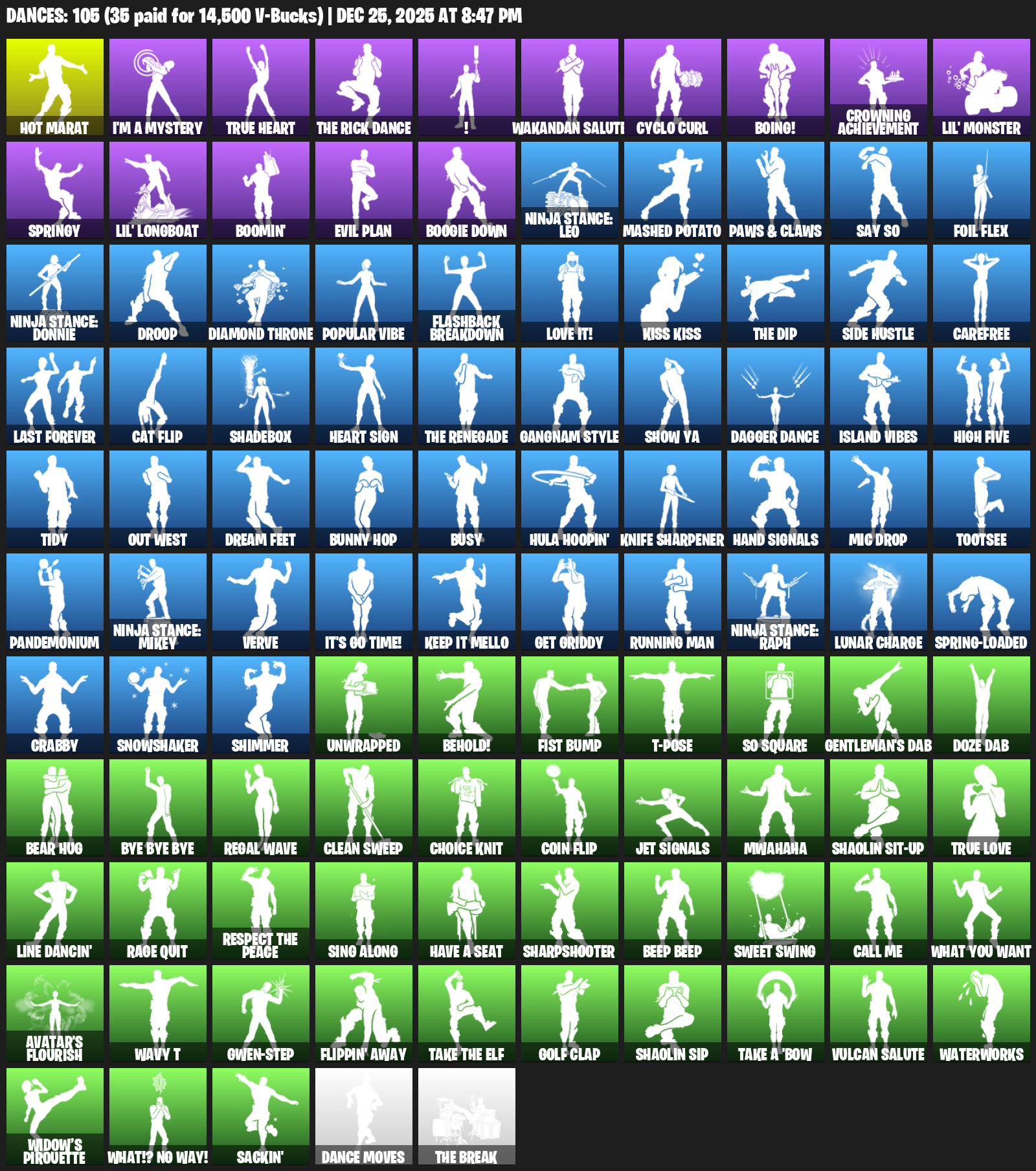 Hot Marat, I’m a Mystery, True Heart, !, Wakandan Salute, Cyclo Curl, Boing!, Crowning Achievement, Lil’ Monster, Springy, Boomin’, Evil Plan, Boogie Down, Ninja Stance: Leo, Mashed Potato, Paws & Claws, Say So, Foil Flex