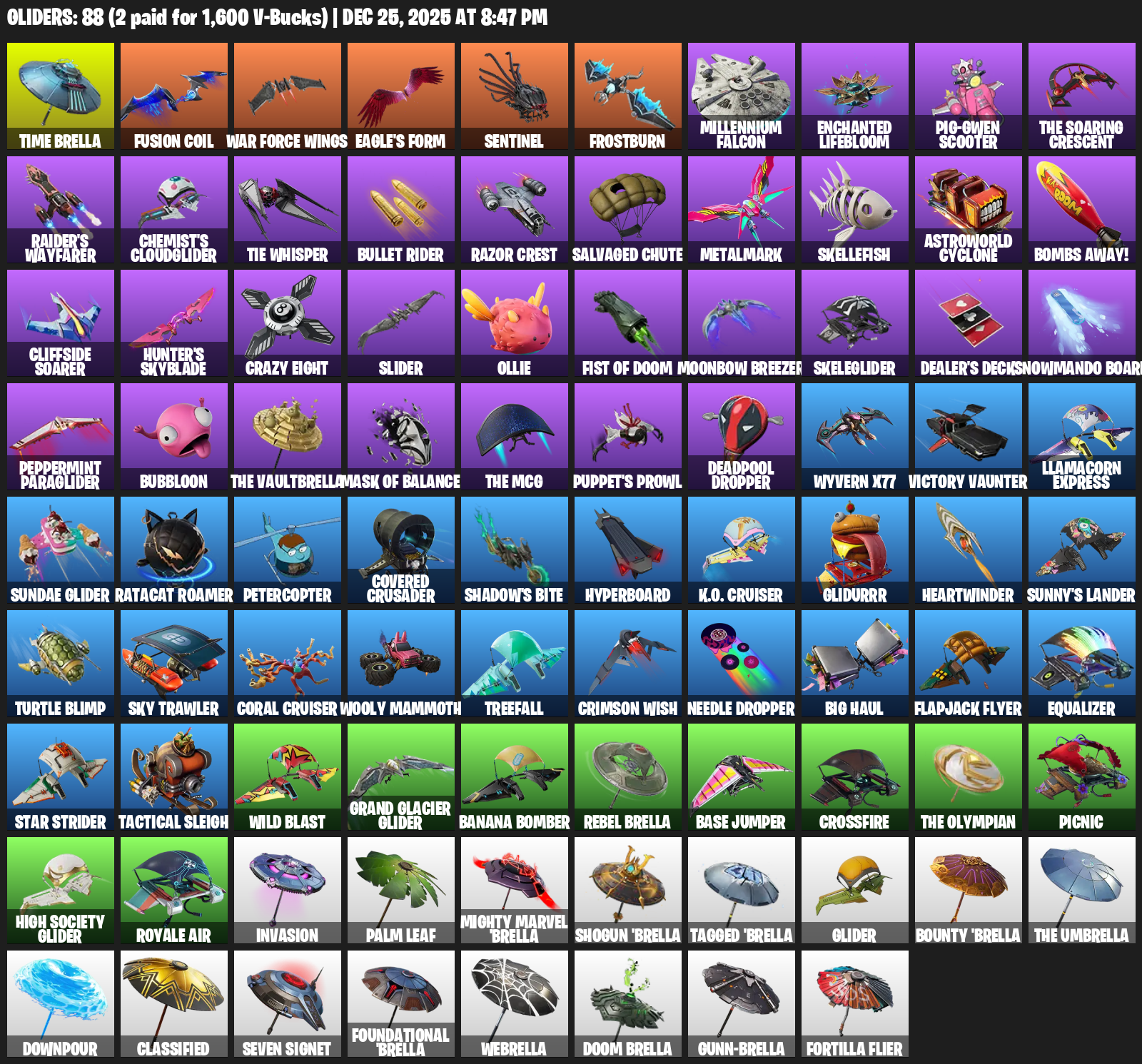 Time Brella, War Force Wings, Eagle’s Form, Sentinel, Frostburn, Millennium Falcon, Enchanted Lifebloom, Pig-Gwen Scooter, Raider’s Wayfarer, Chemist’s Cloudglider, TIE Whisper, Bullet Rider, Razor Crest, Salvaged Chute, Metalmark, Skellefish, Astroworld Cyclone, Bombs Away!