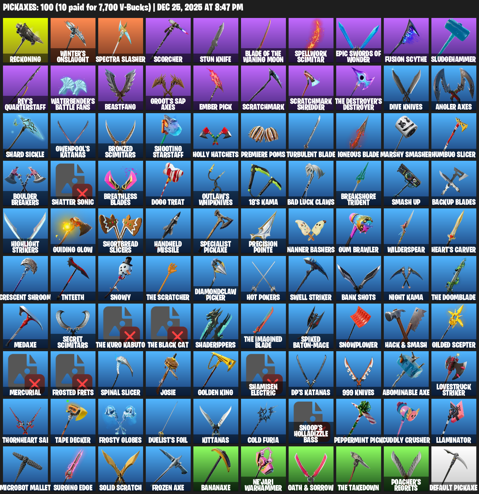 Reckoning, Winter’s Onslaught, Scorcher, Stun Knife, Spellwork Scimitar, Sludgehammer, Rey’s Quarterstaff, Waterbender’s Battle Fans, Beastfang, Groot’s Sap Axes, Ember Pick, Scratchmark, Dive Knives