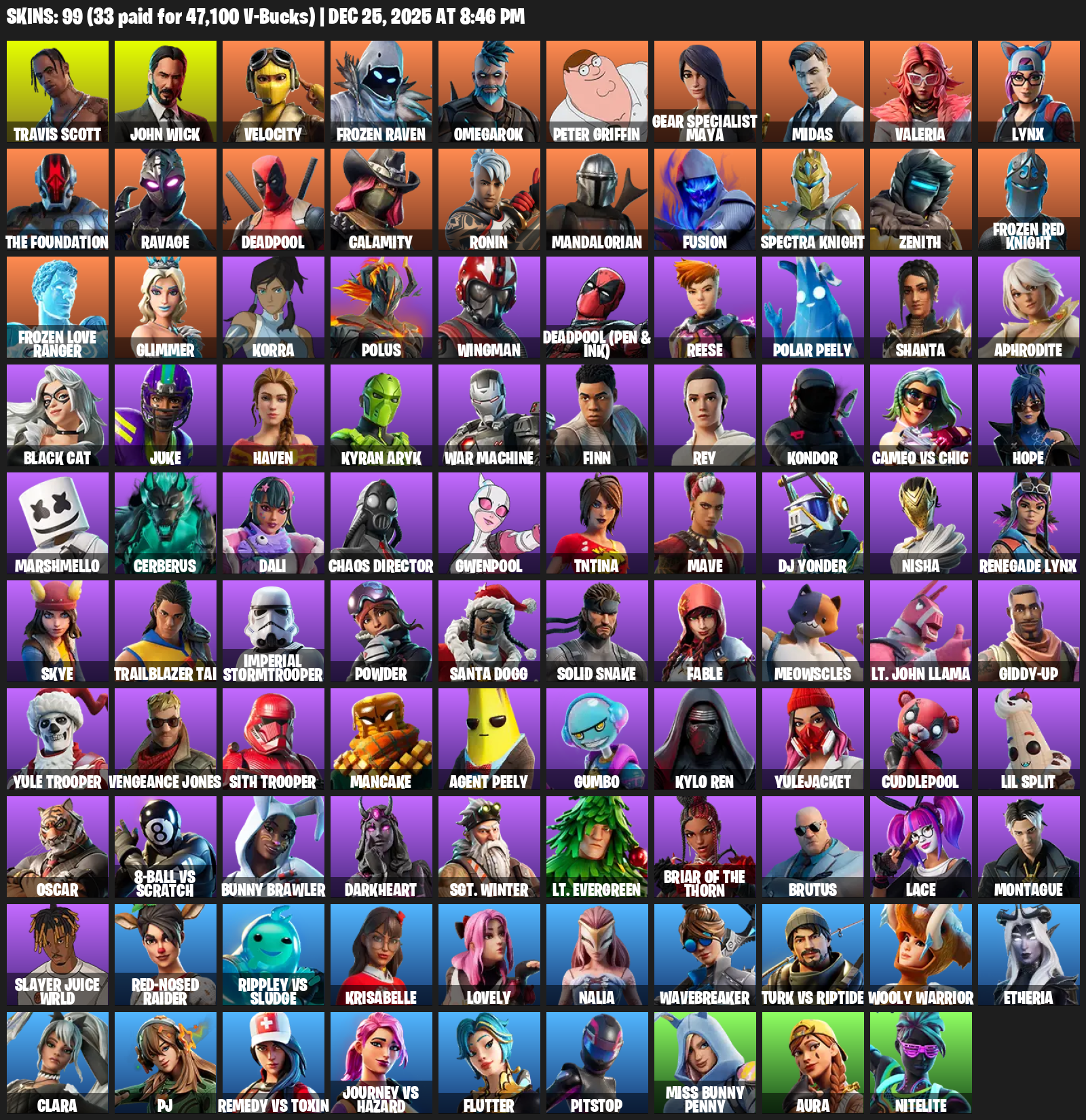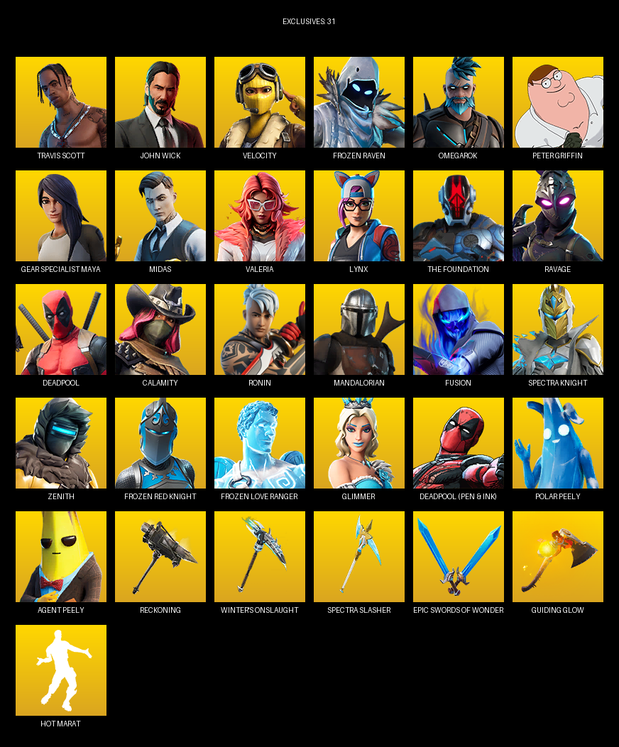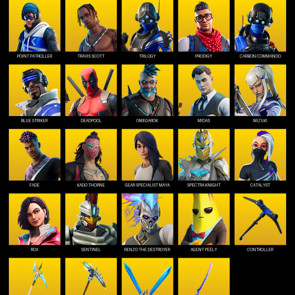 Travis Scott, Gear Specialist Maya, John Wick, Velocity, Frozen Raven, Omegarok, Peter Griffin, Midas, Valeria, Lynx, The Foundation, Ravage, Deadpool, Calamity, Ronin, Mandalorian, Fusion, Spectra Knight, Zenith