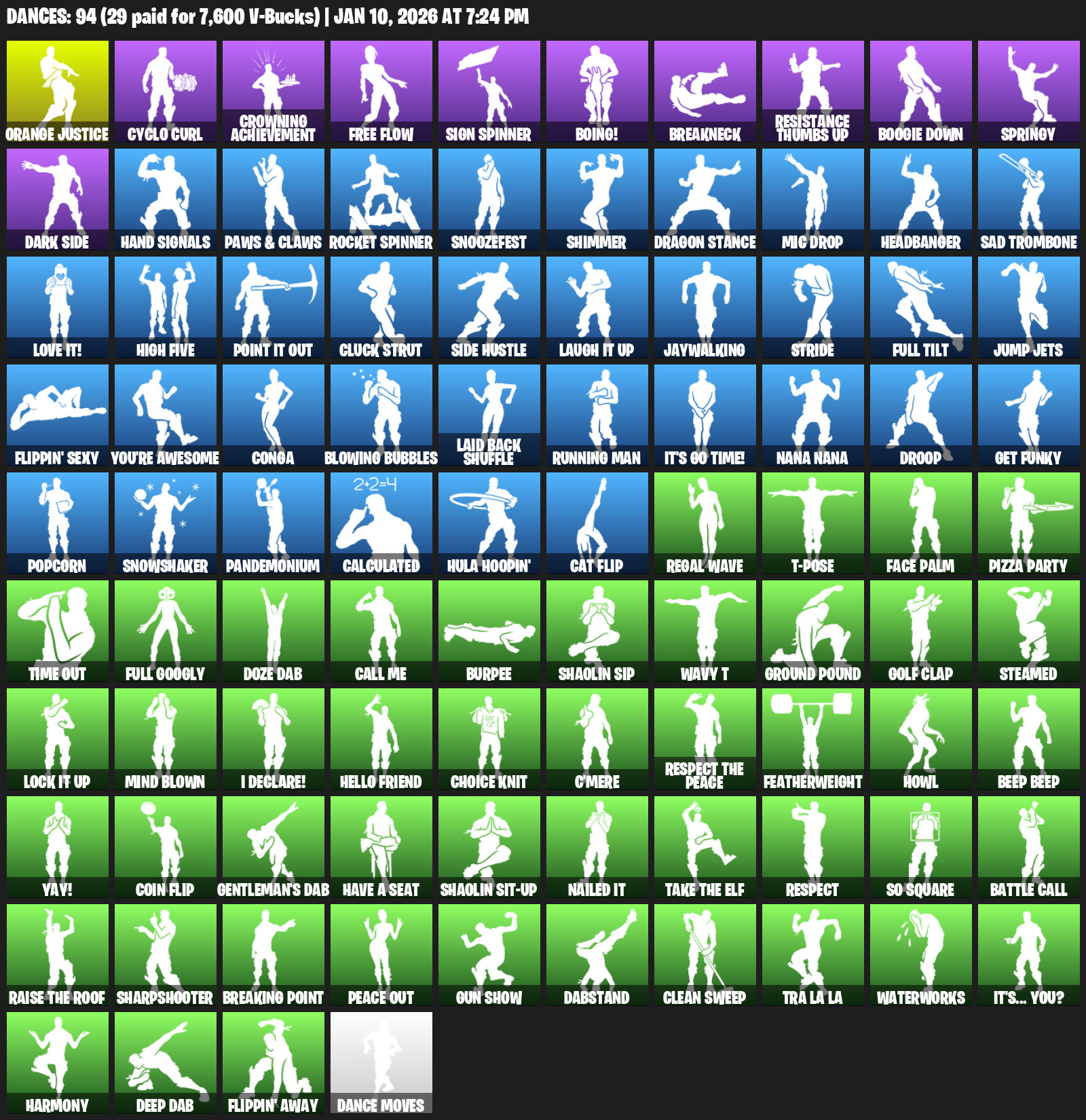Orange Justice, Cyclo Curl, Crowning Achievement, Free Flow, Sign Spinner, Boing!, Breakneck, Resistance Thumbs Up, Boogie Down, Springy, Dark Side, Hand Signals, Paws & Claws, Snoozefest, Shimmer, Dragon Stance, Mic Drop, Headbanger, Sad Trombone